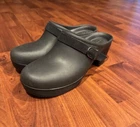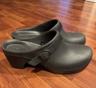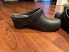 These are Crocs Sarah clogs for women in black, size 8, featuring a closed toe. They have a mid-height heel, suitable for travel and casual wear in summer, fall, and spring. The rubber outsole and breathable design offer comfort for walking and everyday wear. Excellent pre-owned condition. No flaws to notes. Coming from a smoke-free home.