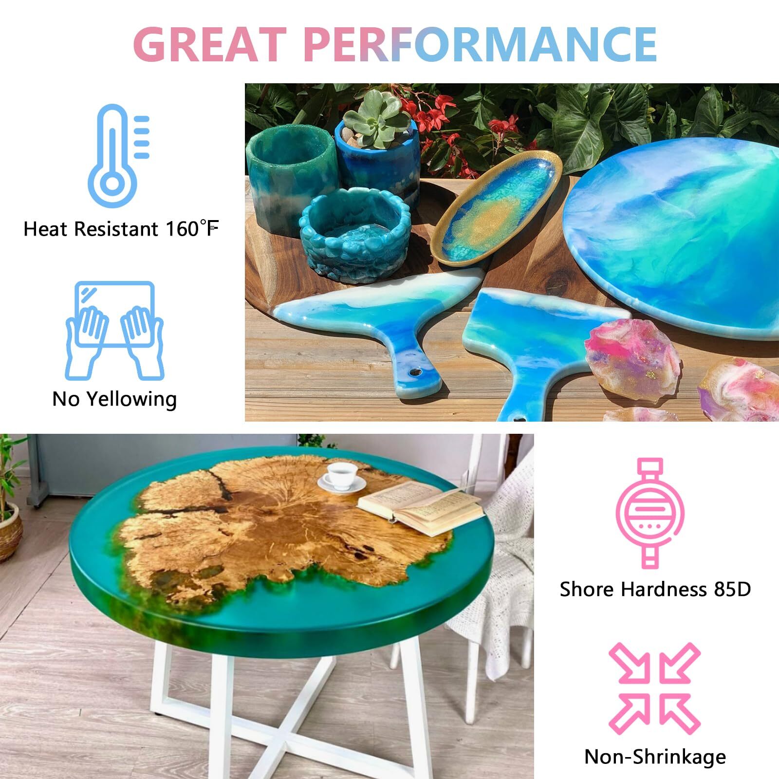 Epoxy Resin 1Gallon - Crystal Clear Epoxy Resin Kit - No Yellowing No Bubble Art Resins Casting for Art Crafts, Jewelry Making, Wood & Molds(1/2 Gallon x 2) 【Perfect Epoxy Resin Kit】:Includes 1/2 gallon resin, 1/2 gallon hardener, 2 pump heads, 2 gloves. Upgraded formula, harder and more wear-resistant, no yellowing in long term use. 【High Quality Resin Epoxy】:Crystal clear, easy to mix, less bubbles and self defoaming self-leveling function, safe and non-toxic, filler does not settle after mixing, easy to complete perfect works without worry. 【Perfect Works】:Glossy surface after the table top epoxy resin is cured, perfect texture, no yellowing and high temperature resistance, wear-resistant and durable, ideal for projects such as desktop coating. 【Easy to Use】:Epoxy resin 1:1 easy to mix, 8 hours drying 24 hours curing, resin heat dissipation temperature is not high will not damage the mold, easy to use very suitable. 【Wide Range of Applications】:Ideal for casting, coating, artwork, suitable for coasters, countertops, crafts, jewelry making, painting, molds, woodwork, etc. Create your great works. Epoxy Resin 1Gallon - Crystal Clear Epoxy Resin Kit - No Yellowing No Bubble Art Resin Casting Resin for Art Crafts, Jewelry Making, Wood & Resin Molds(1/2 Gallon x 2) Shipping We offer FREE shipping on all orders! We ship within Three business days of payment, usually sooner. We use a selection of shipping services such as UPS, FedEx, USPS etc. We only ship to the lower 48 states, no APO/FPO addresses or PO Boxes allowed. Local pickups and combined shipping options are not provided at this time. Return You can return a product for up to 30 days from the date you purchased it. Any product you return must be in the same condition you received it and in the original packaging. Please keep the receipt. Payment We accept payment by any of the following methods: PayPal Please pay as soon as possible after winning an auction, as that will allow us to post your item to you sooner! Feedback Customer satisfaction is very important to us. If you have any problem with your order, please contact us and we will do our best to make you satisfied. Contact Us If you have any queries, please contact us via ebay. We usually respond within 24 hours on weekdays. Please visit our eBay store to check out other items for sale! Thank you for shopping at our store.