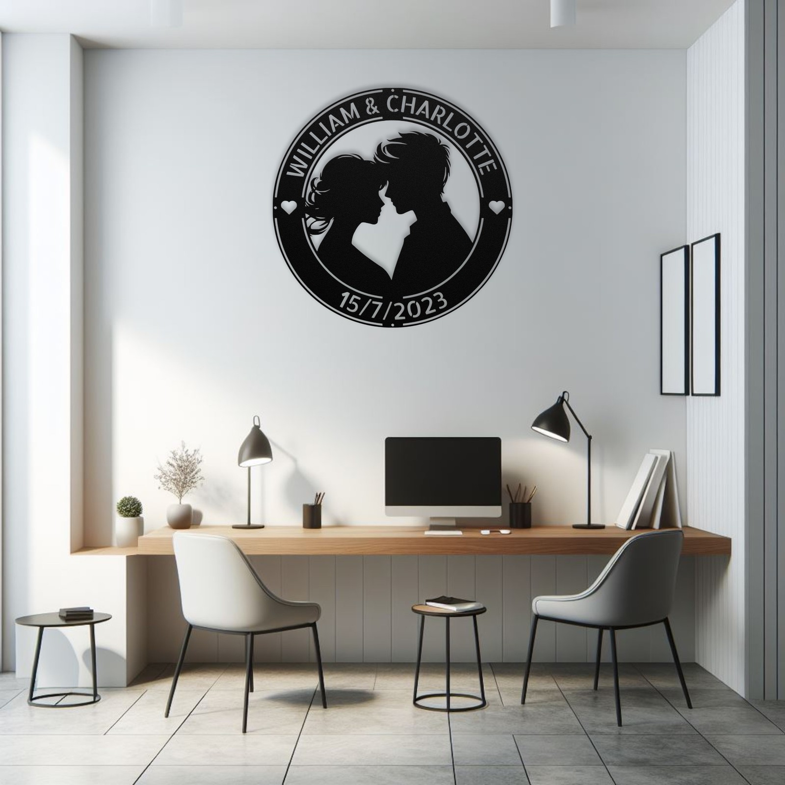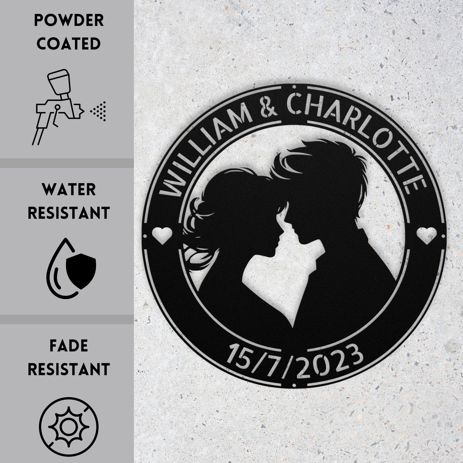 Product Description Celebrate love with this beautiful Personalized Couple Metal Art Sign ! Made from high-quality 16 gauge metal, this custom sign is perfect for commemorating anniversaries, weddings, or any special occasion. With a durable powder coating, it is dust, weather, and water-resistant, making it suitable for both indoor and outdoor use. This personalized metal sign makes a heartfelt gift for Christmas, birthdays, or just because. Add your names or initials for a unique touch that will make it a cherished piece in your home or office. Whether itβs displayed in your living room, bedroom, or garden, this sign adds a personal and romantic element to any space. Key Features: Customizable Design: Personalize with your names or initials for a unique touch. Durable Material: Crafted from sturdy 16 gauge metal for long-lasting appeal. Weather Resistant: Powder-coated finish protects against dust, moisture, and outdoor elements. Versatile Decor: Perfect for indoor or outdoor spaces, enhancing any environment. Great Gift Choice: A thoughtful present for anniversaries, weddings, or special occasions. Charming Design: Adds a romantic and personal touch to your home decor. Make your space feel more special with this Personalized Couple Metal Art Sign! Service and Color Choice My metal signs are designed to be personalized just for you, making them the perfect addition to any space! The default color is Black , but I also offer a variety of beautiful options including Copper, Gold, White, and Silver . After placing your order, simply contact me with your preferred color choice, and I'll ensure your sign is exactly how you envision it. Letβs create something special together! π How Metal Signs Are Measured Metal signs are measured from the widest point to the opposite widest point of the design. The listed size (8β, 10β, 12β, 18β, 24β, 30β, 36β, etc.) always refers to the longest edge of the artwork, not the height only and not the width only. Because every design has its own shape and proportions, the other dimension (height or width) will adjust automatically . π Example (30-Inch Size) When selecting a 30-inch sign , the longest side of the design will measure 30 inches . If the design is wider than it is tall: Width = 30 inches Height adjusts proportionally (often around 18β22 inches depending on the design) If the design is taller than it is wide: Height = 30 inches Width adjusts proportionally This ensures the sign keeps its correct proportions and the original shape, no matter which size is selected. π¨ Custom Designs & Logos Welcome Have a special idea in mind? I can make it happen! Whether you need a business logo , family emblem , pet silhouette , or a one-of-a-kind design , I can create it from scratch and turn it into a high-quality metal sign. You can send your concept, sketch, or photo, and Iβll handle the custom design, editing, and production from start to finish. Your vision becomes real metal artwork made exactly the way you want it. β¨ Custom Any Design: If you have a special idea in mind, I can turn it into a metal sign, just message me! π¦ Ordering & Gift-Ready Each sign is crafted to order with great care and attention to detail. Your piece arrives ready to hang , making it easy to display or give as a thoughtful gift. Whether it's for your home or for someone special, every sign is made to impress and last for years. π Your support means the world to me and my family. Thank you for helping keep this small art business growing. π Production & Shipping Every sign is made to order with a fast turnaround time. Production Time: 1β2 business days Free Shipping: UPS Ground (estimated 2β5 business days ) Expedited Shipping: FedEx 2-Day Delivery available at checkout Shipping Location: All orders ship from Indiana, USA Each order is packed securely to ensure your metal sign arrives safely and ready to display.