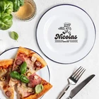 Custom Engraved Enamel Camping Retro Plate Custom Engraved Enamel Camping Retro Plate DETAILS ★ Discover the Perfect Enamel Plates: Ideal for both indoor and outdoor dining: Enjoy your favourite meals with our distinctive Enamel Plates. Whether it's a personalised plate that brings a traditional style to your table or an adventurer's enamel plate perfect for camping and picnics, these plates are a must-have. They make a wonderful gift for the adventurer in the family or any friend who loves the outdoors! Perfect for hiking trips, camping weekends, lazy beach days, and picnics, these plates add a unique touch to your table setting. ★ Retro Charm and Timeless Design - Our Enamel Plates feature a classic blue and white finish reminiscent of American diners, adding a nostalgic touch that guests will love. - The retro blue and white enamel design not only enhances the aesthetic appeal but also makes a statement on any table. The blue rim creates a unique look and makes it easy for people to identify the edge of the plate, ideal for care homes or those with vision difficulties. ★ Perfect for Any Dessert & Food: Ideal for both indoor and outdoor dining, these plates available in two sizes, 24.5 cm and 30 cm, provide a stylish means of serving cold meats, steak, sandwiches, BBQ, cheese, pasta, puddings, desserts, homemade cakes, , pancakes, waffles, sweet treats, breakfast, and more. ★ Timeless Design: The retro blue and white enamel design not only enhances aesthetic appeal but also makes a statement on any table, elevating the presentation of your food. The blue rim creates a unique look and makes it easy for people to identify the edge of the plate, ideal for care homes or those with vision difficulties. ★ Durable and Long-Lasting: Crafted from heavy-duty stainless steel and covered with an ultra-durable, fuséd-glass coating, these plates develop a unique character over time. The enamel coating is heat and chemical resistant, making these plates highly versatile. They are safe for use in the oven and microwave for reheating food and can be easily cleaned in the dishwasher. The stainless-steel interior ensures long-lasting durability, even in customer-facing environments. ★ Exceptional Versatility: The enamel coating on these plates is both heat and chemical resistant, allowing you to serve homemade ice cream directly from the freezer or bake a delicious apple crumble in the oven. These bowls can handle it all. ★ Personalisation Options: Personalise your Enamel Kitchenware with initials, a name, or a custom logo to create a unique, personalised piece that reflects your style and identity. They make exceptional gifts for kids, Father’s Day, Mother’s Day, teachers, wedding favours, birthdays, housewarmings, couples, and any occasion where a thoughtful touch is appreciated. Choose from a wide range of designs to find the perfect match. ★ Ideal for Various Settings: Designed to withstand the rigours of everyday use, cleaning, and storage, our Enamel Tableware are equally at home in commercial settings like restaurants, cafes, and hotels. Their durability ensures they maintain a fresh appearance even with frequent use. It can be safely uséd it in the oven and microwave when reheating drinks. ★ Corporate Gifting and Promotions: Enhance your business relationships by personalising Enamel Plates with client names, monograms, or company logos. They make memorable closing gifts or promotional items that leave a lasting impression. ★ Stylish: Choose from a wide range of design options to personalise your plate, ensuring it reflects your unique style. ★ Safe: BPA-free and crafted with quality materials, our enamel tableware are designed with your safety and satisfaction in mind. ★ Care Instructions: - Our enamel tableware can be washed in the dishwasher, ensuring quick and convenient cleaning. The classic retro blue and white enamel tableware gains a unique character with repeated use, as chips and imperfections contribute to its individual charm. - To maintain a flawless appearance, avoid using the dishwasher. Clean gently with non-abrasive cleaners and avoid scourers to preserve the enamel finish. SPECIFICATIONS Dimensions : Available in 2 Sizes: - Medium: H x D: 25 x 245 mm ( 0.98" x 9.65" ) - Large: H x D: 25 x 300 mm ( 0.98" x 11.81" ) Material: Enamel Steel, Fuséd Glass Coating Technique: Laser Engraved. Personalise any design with names, dates, templates, logos, or images. Our high-quality, long-lasting laser engraving surpasses vinyl stickers, ensuring durability and a professional finish. Note: Chips and imperfections are part of products' individual look. HOW TO ORDER 1. Choose your preferred size: Select whether you want Medium or Large size 2. Choose your Engraving Side: Select whether you want engraving on the top or bottom rim, the centre of the plate, or both. 3. Type in Engraving Style and Order: Specify the engraving style and the exact text you want engraved based on our provided Design Template Options. You can add any additional instructions in brackets (). Please refer to Style #A - Style #R for the Plate Rim's Engraving Example: - Top Rim: Style #O: Timothy Harrington - Bottom Rim: Style #O: Amelia Harrington - Centre: Style #9: mr&mrs Harrington, 05th May 2025 ▸If you want to use your own logo, please attach/ send us your file once you finish . Please note to attach the highest resolution file as possible to avoid quality issues Not all files are scanned prior to manufacturing, if you're not sure, please send us an email after placing the order to confirm if the file is of an acceptable quality. ▸You can combine or pick any font, icon, style, etc between our provided designs, or choose not to include a date, title or icon for example. All artwork based on our available design is free of charge. ▸If you don't like any of our template and want to create your own bespoke artwork design, please feel free to contact us with any questions you may have,