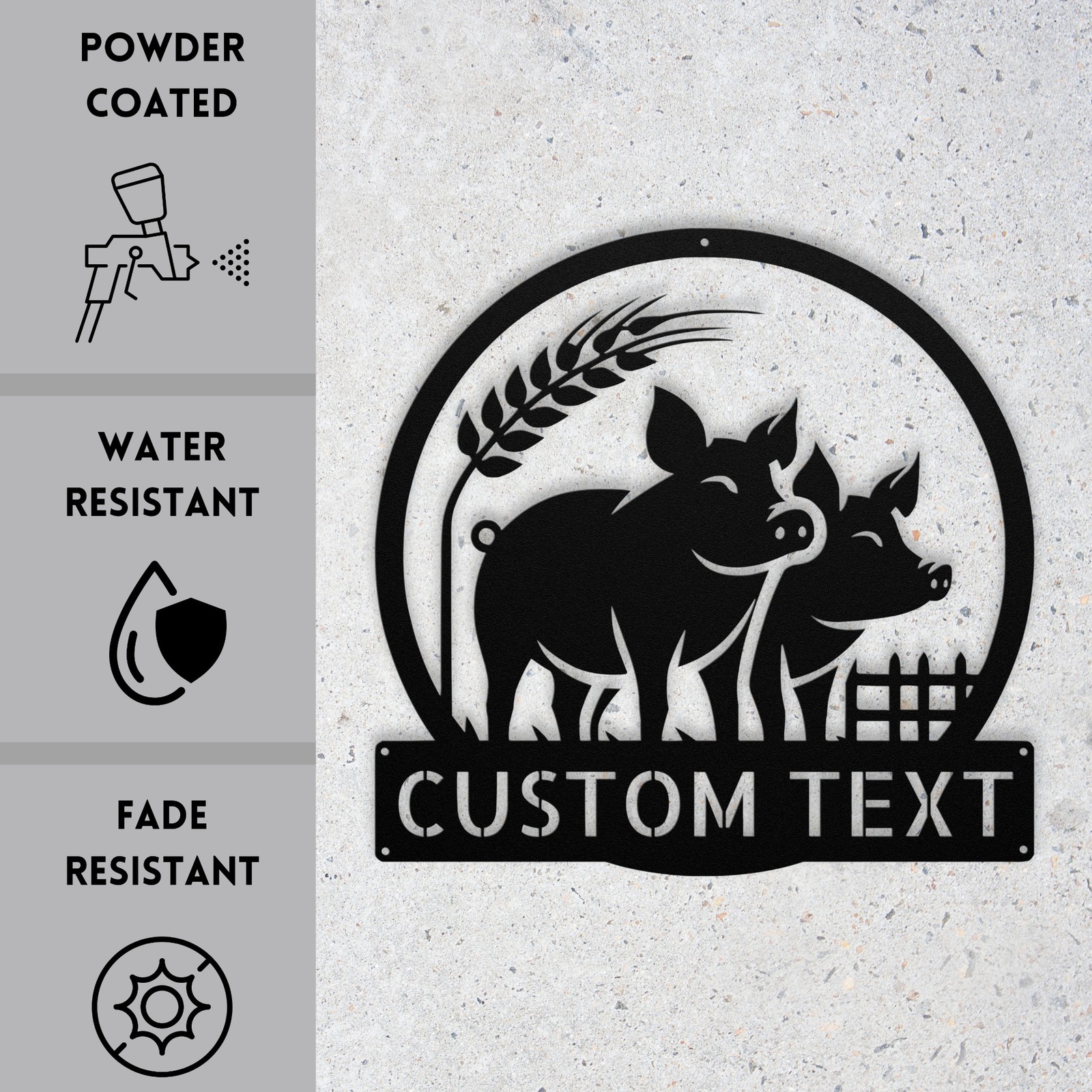 Product Description Add a charming touch to your space with our Custom Farmhouse Pigs Metal Sign ! This rustic home decor piece is perfect for farm lovers and adds a warm, welcoming vibe to any room. Made from high-quality 16-gauge metal, this sign is designed to withstand the elements with its durable powder coating, making it both dust and weather resistant. Whether youβre looking for a unique gift for Christmas, a birthday, or any special occasion, this personalized farm sign is a thoughtful choice. Itβs also great for decorating your own home or office, showcasing your love for the farm life. Key Features: Customizable Design : Personalize the sign with your name or a special message. Durable Material : Crafted from 16-gauge high-quality metal for long-lasting use. Weather-Resistant : Powder-coated finish protects against dust, rain, and rust. Versatile Use : Suitable for both indoor and outdoor display. Perfect Gift : A unique and heartfelt present for any farm or animal lover. Bring a touch of rustic charm to your decor or surprise a loved one with this delightful metal sign. Order yours today and make your space truly special! Service and Color Choice My metal signs are designed to be personalized just for you, making them the perfect addition to any space! The default color is Black , but I also offer a variety of beautiful options including Copper, Gold, White, and Silver . After placing your order, simply contact me with your preferred color choice, and I'll ensure your sign is exactly how you envision it. Letβs create something special together! π How Metal Signs Are Measured Metal signs are measured from the widest point to the opposite widest point of the design. The listed size (8β, 10β, 12β, 18β, 24β, 30β, 36β, etc.) always refers to the longest edge of the artwork, not the height only and not the width only. Because every design has its own shape and proportions, the other dimension (height or width) will adjust automatically . π Example (30-Inch Size) When selecting a 30-inch sign , the longest side of the design will measure 30 inches . If the design is wider than it is tall: Width = 30 inches Height adjusts proportionally (often around 18β22 inches depending on the design) If the design is taller than it is wide: Height = 30 inches Width adjusts proportionally This ensures the sign keeps its correct proportions and the original shape, no matter which size is selected. π¨ Custom Designs & Logos Welcome Have a special idea in mind? I can make it happen! Whether you need a business logo , family emblem , pet silhouette , or a one-of-a-kind design , I can create it from scratch and turn it into a high-quality metal sign. You can send your concept, sketch, or photo, and Iβll handle the custom design, editing, and production from start to finish. Your vision becomes real metal artwork made exactly the way you want it. β¨ Custom Any Design: If you have a special idea in mind, I can turn it into a metal sign, just message me! π¦ Ordering & Gift-Ready Each sign is crafted to order with great care and attention to detail. Your piece arrives ready to hang , making it easy to display or give as a thoughtful gift. Whether it's for your home or for someone special, every sign is made to impress and last for years. π Your support means the world to me and my family. Thank you for helping keep this small art business growing. π Production & Shipping Every sign is made to order with a fast turnaround time. Production Time: 1β2 business days Free Shipping: UPS Ground (estimated 2β5 business days ) Expedited Shipping: FedEx 2-Day Delivery available at checkout Shipping Location: All orders ship from Indiana, USA Each order is packed securely to ensure your metal sign arrives safely and ready to display.