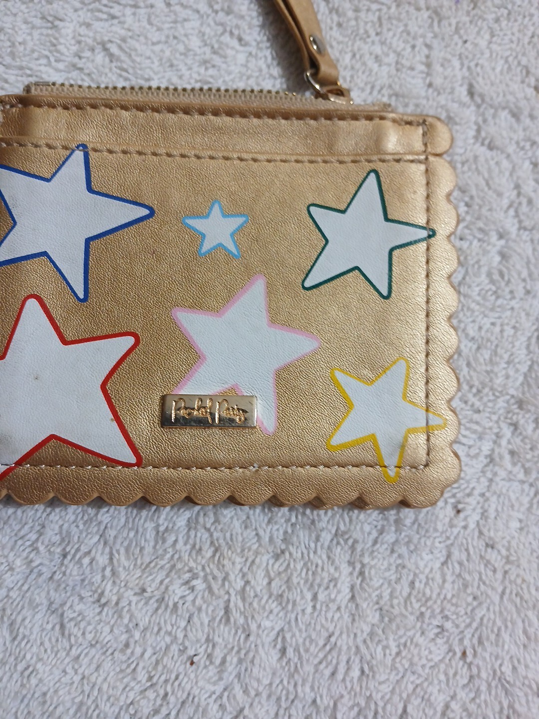 This adorable gold keychain cardholder coin purse is perfect for any child star or party fun money Wallet. Made of faux leather and acrylic material, this XS size wallet features a geometric pattern with a zipper and logo accents. The zip-around style and money theme make it a great addition to any woman's accessories collection. With credit card slots and a packed party fund, this wallet is both functional and fashionable. The gold color and leather fabric type add a touch of luxury to any outfit. Whether you're looking for a small wallet for your everyday essentials or a fun accessory for a night out, this Money brand wallet is the perfect choice.