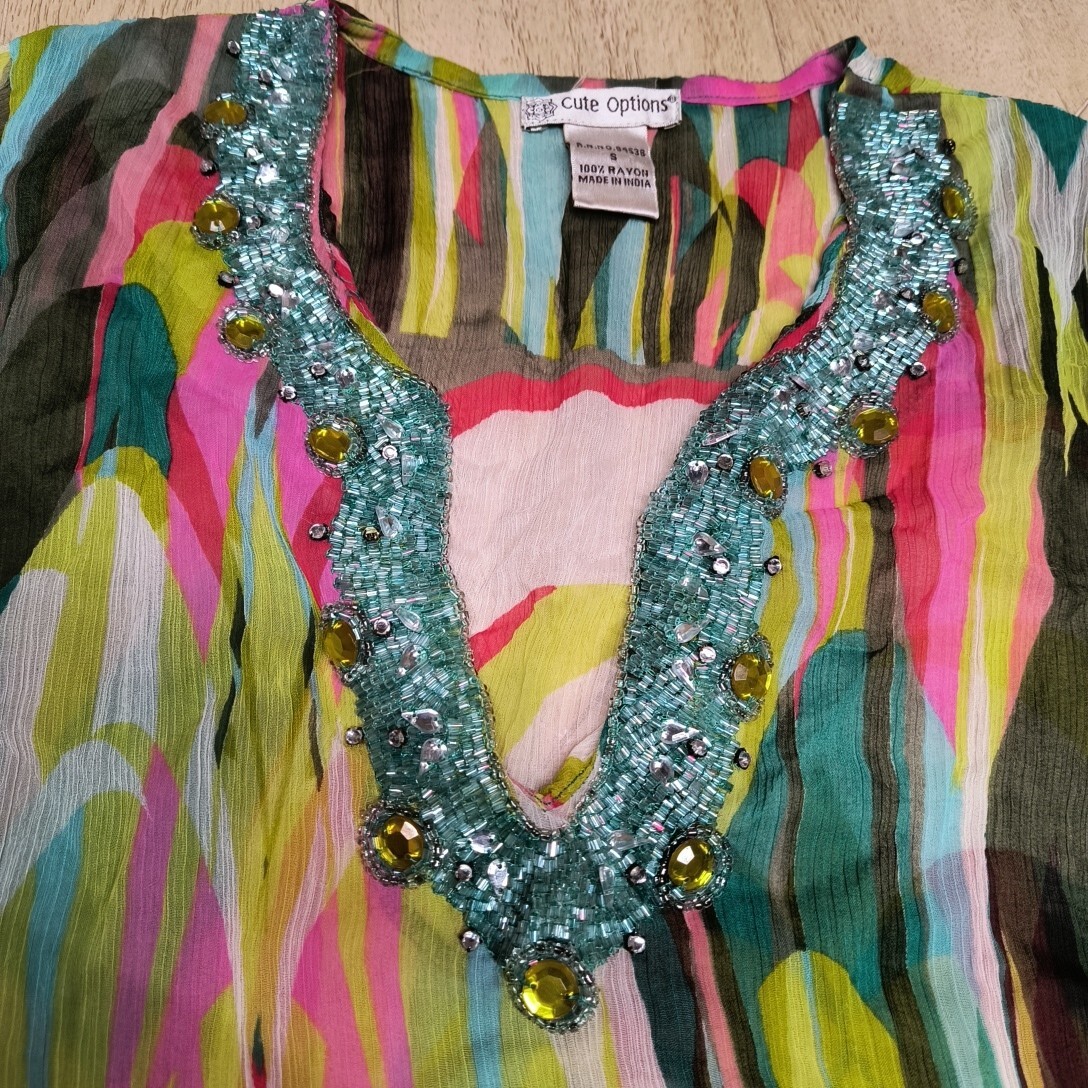 Cute Options Sheer Rhinestone Beaded Tunic Top / Swimsuit Cover Up Multicolored. Size small. Condition note-there is a tiny hole near the bottom of the front. Pictures in listing