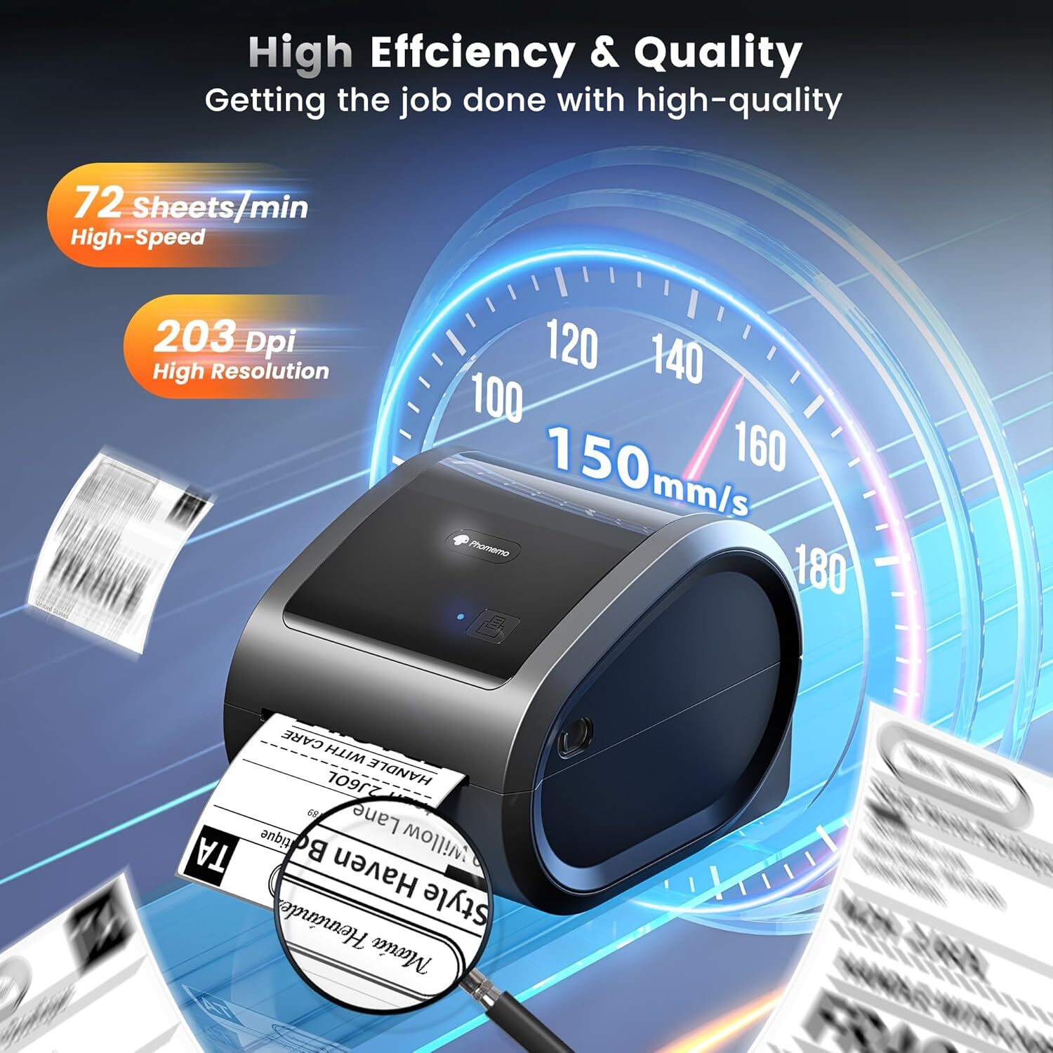 About this item Space-Saving Internal Paper Holder: This thermal printer features a built-in paper holder, eliminating the need for an external label rack. This design helps save desktop space and keeps your workspace organized. Suitable for small businesses and home offices, this label printer reduces clutter and fits seamlessly into any environment. Wide Printing Range and High Speed: This versatile thermal printer supports a printing width of 1-4.6 inches, making it ideal for various printing tasks, from small labels to wider receipts. With a printing speed of up to 72 PCS/min, it efficiently handles high-volume printing needs, enhancing workflow efficiency for your small business. Dual Connectivity Options: This label printer offers both USB and Bluetooth connectivity, providing compatibility with a variety of devices. Easily pair with Android and iOS devices via Bluetooth using the compatible app. Additionally, it supports USB connections to Windows, Mac, Chrome OS, and Linux systems, meeting diverse user requirements for a desktop thermal label printer. Ink-Free Thermal Printing Technology: Equipped with ink-free thermal printing technology, this thermal printer reduces ink costs and provides efficient, high-quality prints. With a printing speed of 150mm/s and high-resolution output, each label is printed with sharp and precise detail. This eco-friendly technology reduces wait times and improves the overall printing experience, making it perfect for a shipping label printer. Comprehensive App Support and Easy Setup: The postage label printer comes with app support, offering a range of free templates for customizing labels and print content. It supports the creation of various types of labels, including shipping labels, address labels, barcode labels, and thank-you stickers. The printer includes detailed video tutorials and user manuals to help you set it up quickly. Product dimensions: 10.31 x 10.31 x 7.87 inches
