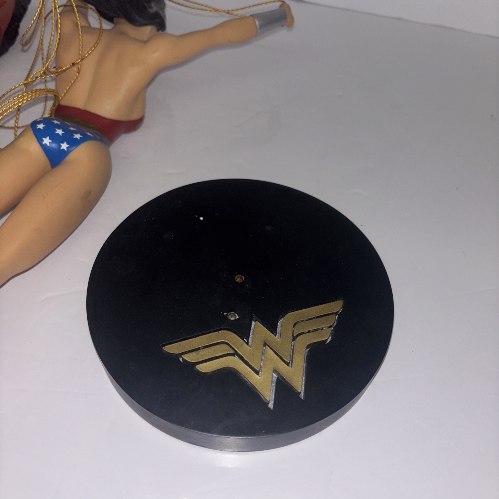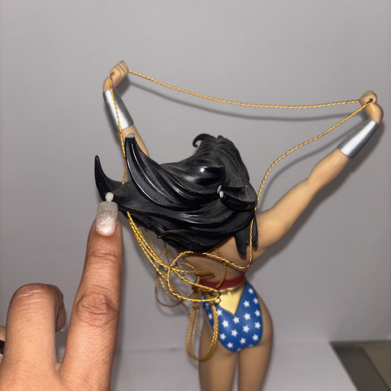 The product is a Wonder Woman statue featuring Wonder Girl, from DC Comics. The statue, designed by Adam Hughes, is a collectible item perfect for fans of the Wonder Woman franchise. This meticulously crafted piece is a must-have for any comic book or memorabilia collector, showcasing the iconic characters from the DC Comics universe in a beautifully detailed and visually appealing manner. **please see picture some of her hair points are not there. ***