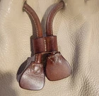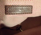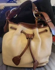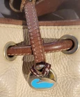 Elevate your style with this vintage bucket bag from Dooney & Bourke. The bag is made of high-quality leather with a pebbled finish and features a drawstring closure. The adjustable shoulder strap and brown handle/strap color add to its functionality and versatility. The gold hardware color and buckle accent give it a touch of elegance. This large-sized bag has a cylinder shape and measures 14in in width, 11in in height, and 5in in depth. It comes with a key holder and bag charm for added convenience. The red lining color and inner pockets make it easy to organize your essentials. The bag is waterproof and lined, making it suitable for all weather conditions.