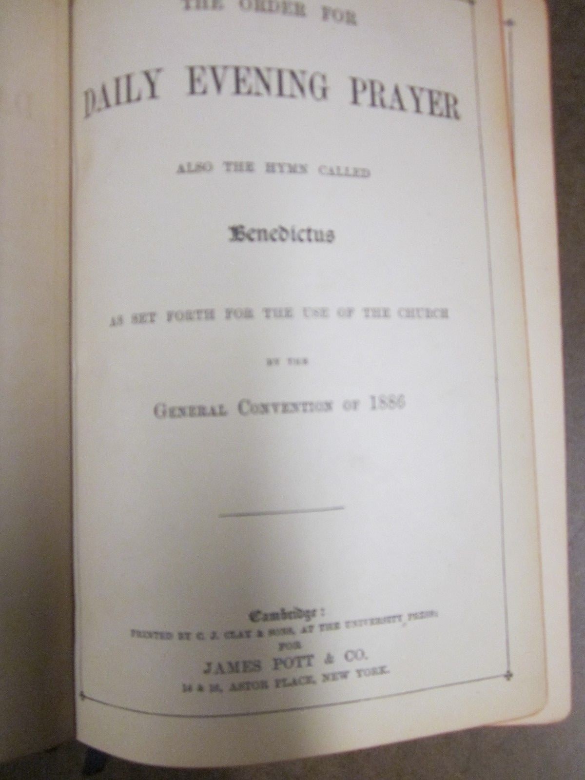 The Order for Daily Evening Prayer. Also the Hymn Called Benedictus. As Set for the use of the Church by the General Convention of 1886. James Pott & Co., publisher, New York. 580 pages. Includes an Appendix of 16 pages entitled: Alterations and Addition in the Book of Common Prayer Finally Adopted by The General Convention in the Year of Our Lord 1886. 4 3/4 by 7 inches. Leather bound. There are only four (4) other copies for sale on the used book market, three selling in the $75 range, the other at $128. Thank you.