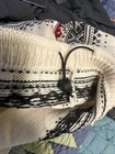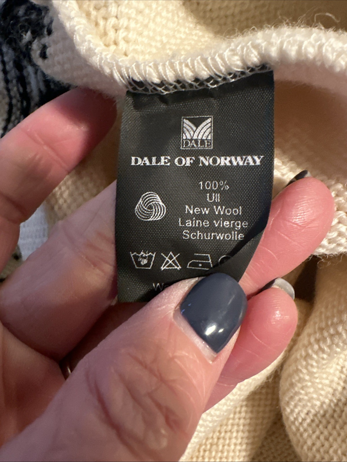 The product is a vintage Dale of Norway sweater in size Large, featuring a classic Fair Isle pattern in white color. This tight-knit sweater is made of wool, with long sleeves and a pullover style, suitable for casual occasions during the winter and fall seasons. It also includes the brand's logo as an accent, and is designed for regular fit for unisex adults. Perfect for skiing and outdoor activities, this sweater exudes a timeless and stylish look.