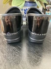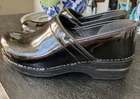 READ -The product is a pair of Dansko Professional clogs for women in size 41, featuring a sleek black patent leather upper material. These slip-on clogs have a standard shoe width and a solid color, perfect for those seeking both style and comfort. With a professional design and a classic clog style, these shoes are described as "like new," ensuring a high-quality appearance for the wearer. Perfect for those in need of comfortable and stylish footwear, these Dansko clogs are a versatile option for comfort and style while on the job. Very light wear and minor scuff in the photo.