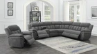 SHIPPING IS NOT FREE. EMAIL FOR SHIPPING COSTS. Wrapped in a charcoal performance chenille, this power reclining sectional is soft to the touch. Three (3) wall-hugging reclining seats. For added convenience, there is a single lift-top console for extra storage, as well as two (2) removable stainless steel cup holders for keeping refreshments close at a hand. 1-inch 3 lbs. cool gel memory foam topper Beneath the upholstery is supportive pocket coils and a cool gel memory foam topper. Measures 128" X 114"X 40"H. Set includes: One (1) LAF recliner, one (1) console, one (1) armless chair, one (1) wedge, one (1) armless recliner and one (1) RAF recliner. Listing is for sectional only, however a custom auction can be designed to include matching recliner shown.