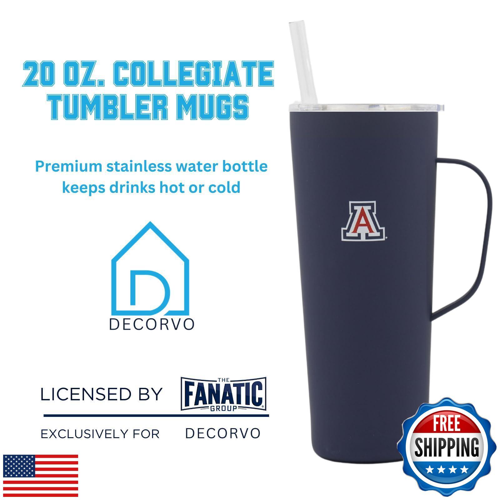 Decorvo NCAA 20 oz. Stainless Steel Tumbler with Handle - Officially Licensed Double Walled Insulated Roadie with Slide Lid and Straw (Arizona Logo - Navy) Features College Pride - show your college pride for your alma mater ith this collegiate 20 oz travel mug. The double walled stainless steel allows for dual purpose use of this tumbler, either for hot coffee or use as a cold water bottle Cup Holder Friendly - this officially licensed tumbler with a 3 inch wide bottom fits nicely into your cup holder whether you are going to the stadium, to school or to work Slide-Top Lid and Straw - whether you want to chug your drink with the easy to slide lid or with the included straw, this artisticly designed mug is the perfect gift Variety of Styles - with several different colors and styles to choose from, these stainless steel tumbler drinkware will match perfectly with any of your college gear Care Instructions - Hand wash only Shipping Free & Fast Shipping: We offer free shipping to most of the USA with a normal delivery time of 3-7 days. However, due to the current situation, additional delivery time (up to 3 weeks) may be required for some items. Alternative Carriers: We may use alternative carriers (e.g., USPS, FedEx, UPS) to ensure your package arrives safely and on time. Due to the use of multiple carriers, we are unable to provide a tracking number automatically. Handling Time: Orders are processed and shipped within 1-2 business days of receiving cleared payment. Shipping Restrictions: Shipping to Alaska, Hawaii, Puerto Rico, Guam, and other US territories may incur shipping charges or delivery restrictions. Please contact us before ordering, or your order can be refunded/cancelled. State Restrictions: Certain items may not be shipped to California due to state regulations. Contact for Tracking Updates: If you require tracking updates or have any concerns about the delivery of your order, please feel free to contact us, and we will be happy to assist you. Return Policy 30-Day Hassle-Free Returns: If you are not completely satisfied with your purchase, you can return the item for free within 30 days of receiving it for a full refund or exchange. Easy Return Process: Contact us, and we will provide you with a prepaid return shipping label and detailed instructions. No Restocking Fee: There are no restocking fees for returns. However, the buyer is responsible for return shipping costs if the return is not due to a seller's error. Refund Processing: Refunds will be processed within 1 business day of receiving the returned item in its original condition. Payment We accept all major credit cards, PayPal, and Apple Pay for your convenience. Your payment information is secure and encrypted to ensure a safe and seamless transaction. Please complete your payment within 3 days of purchase to avoid any delays in shipping. Feedback Your feedback is extremely important to us. We strive to provide the best products and customer service possible. If you are satisfied with your purchase, please take a moment to leave us a positive review. If you have any concerns or issues with your order, please contact us before leaving negative feedback. We are committed to resolving any problems and ensuring your satisfaction. Contact Us If you have any questions or concerns, please feel free to reach out to our customer support team. You can contact us through the eBay messaging system. We are available Monday to Friday, 9:00 am to 5:00 pm EST, and we will do our best to respond to your inquiry within 24 hours. Thank you for supporting our small family business!