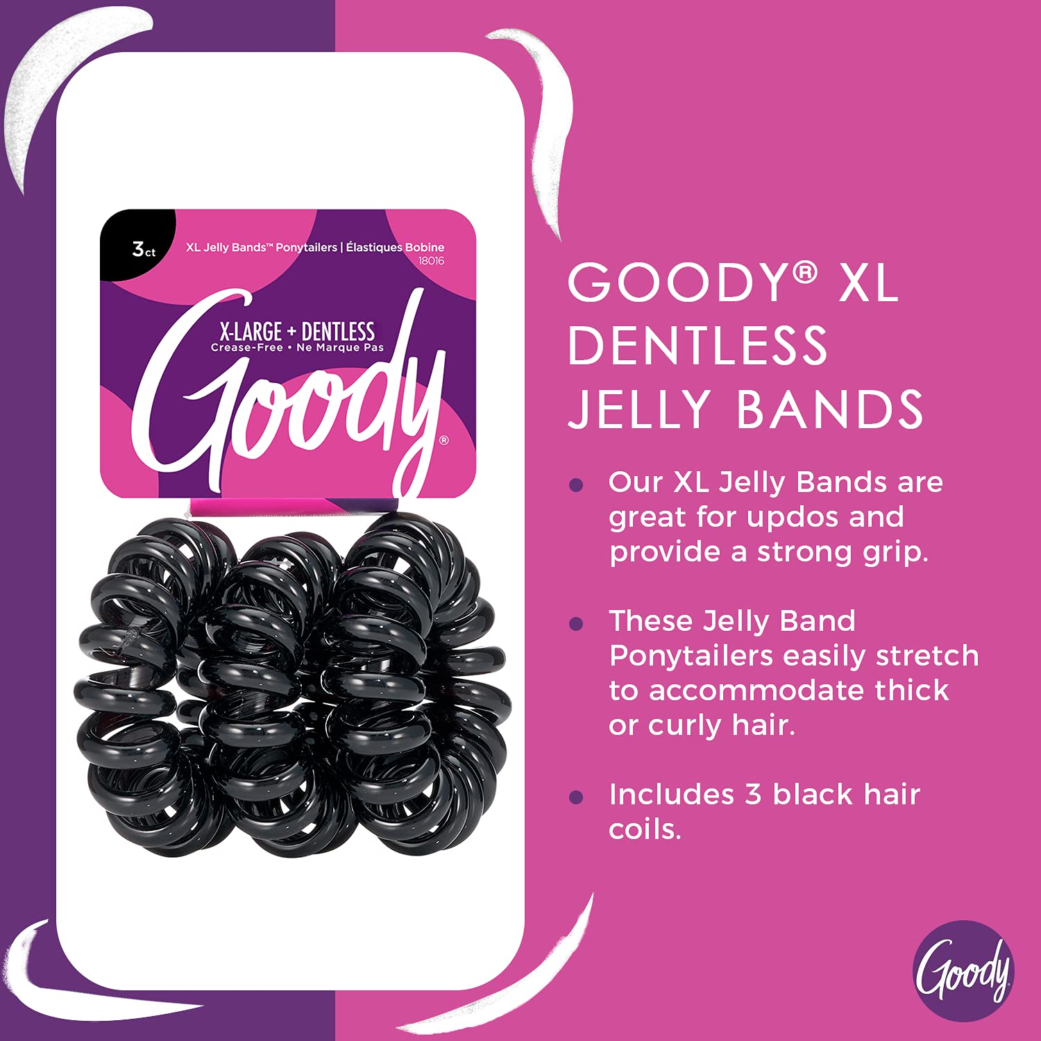 Goody XL Dentless Jelly Bands: Our XL Jelly Bands are great for updos and provide a strong grip. Includes 3 black hair coils. Crease-Free Hold: Our Dentless Coils allow you to style hair exactly how you want, without a crease or ponytail bump in sight! Perfect For Thick Or Curly Hair Types: These Jelly Band Ponytailers easily stretch to accommodate thick or curly hair. It's All Goody: Provides hair-loving, wearable comfort. Goody: Bringing style and innovation to your accessory game, Goody believes that fun and function are not mutually exclusive. Goody is with you for every moment of every day with bright prints, patterns, and fashion accessories to step up your game. Goody XL Dentless Jelly Bands allow you to style hair exactly how you want, without a snag or crease in sight. Easily stretches to accommodate thick hair. Our Jelly Bands are great for updos, and provide a strong grip with hair-loving, wearable comfort without the creases. Perfect for thick or curly hair types.