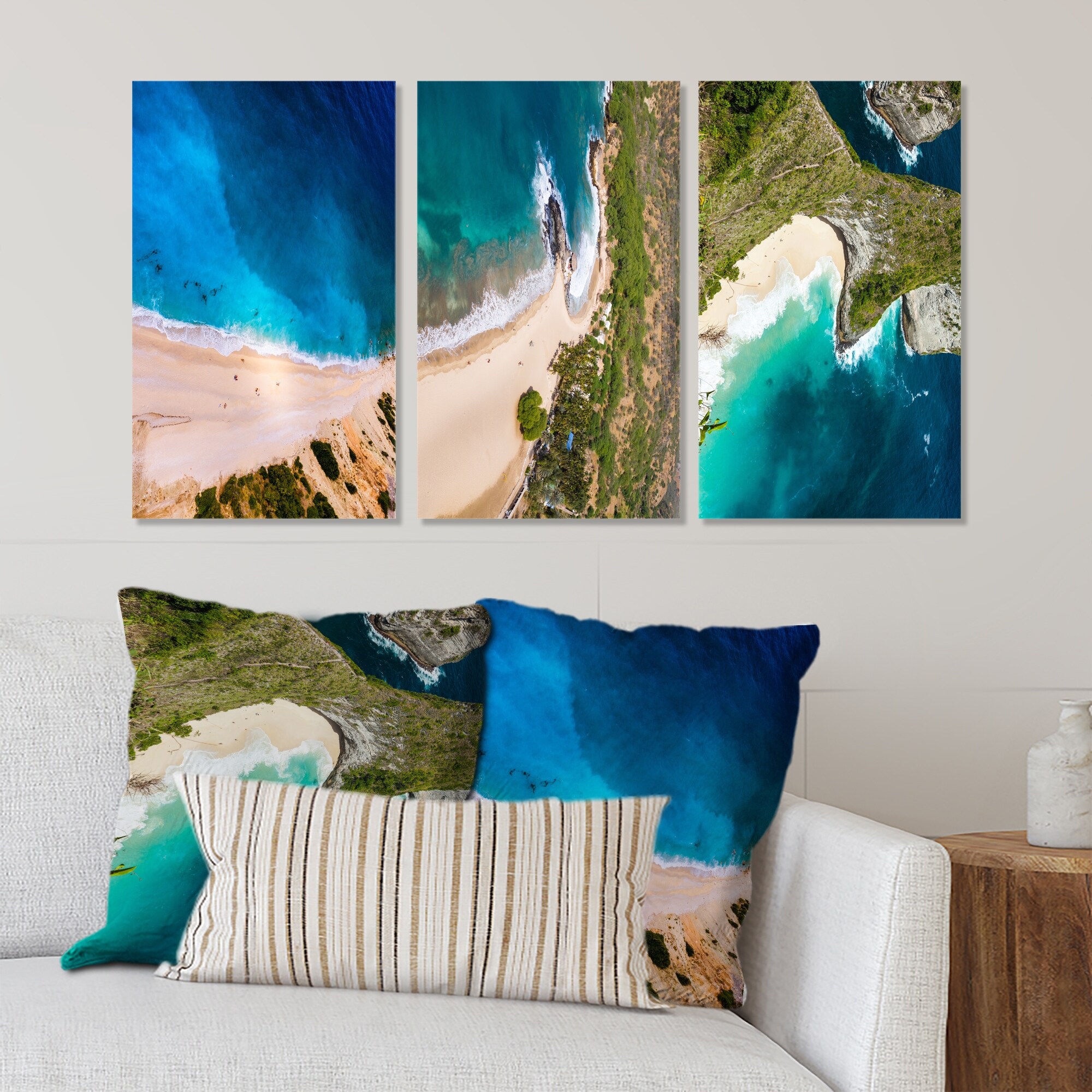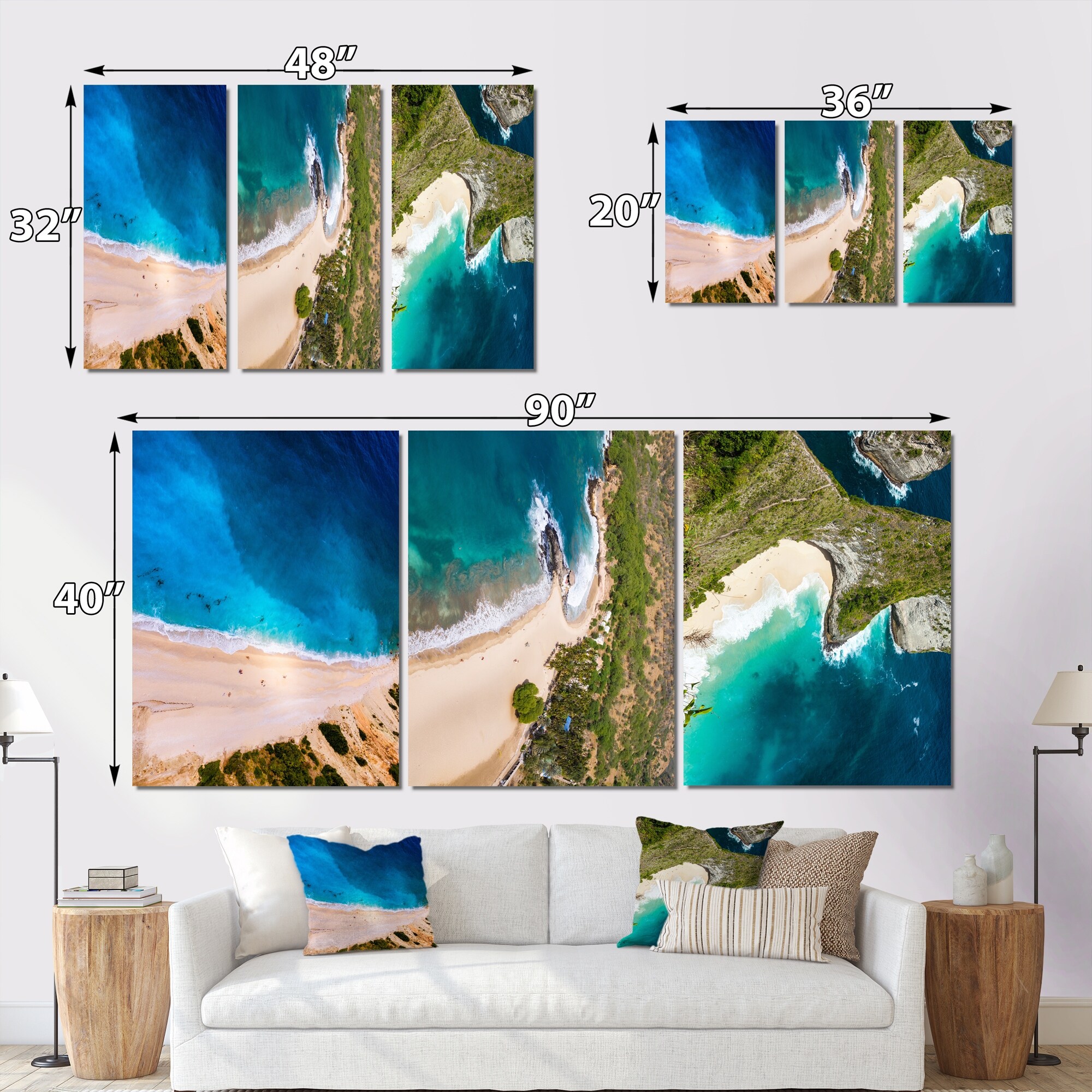 This Beach Collage is a Collection of 3 Canvas Art printed using the highest quality fade resistant ink on canvas. Every one of our fine art giclee canvas prints is printed on premium quality cotton canvas, using the finest quality inks which will not fade over time. Each giclee print is stretched tightly over a 1 inch wood sub frame ensuring the canvas is taught and does not buckle. This canvas art print is gallery-wrapped (the design continues on the sides) , giving it a real art gallery feel. All of our canvas prints are carefully packaged with plastic protection, fragile labeling and sturdy boxes to ensure a safe delivery. Every canvas print arrives ready to hang on the wall, with the hanging kits included.- Set Include: 3 Pieces of 12"x20"/ 16"x32" / 24"x36" / 30"x40"- Overall Free Shipping Over $49.99* Details Designart 'Aerial View Of Blue Ocean With Beach' Nautical & Coastal Art Set of 3 Product Description: This Beach Collage is a Collection of 3 Canvas Art printed using the highest quality fade resistant ink on canvas. Every one of our fine art giclee canvas prints is printed on premium quality cotton canvas, using the finest quality inks which will not fade over time. Each giclee print is stretched tightly over a 1 inch wood sub frame ensuring the canvas is taught and does not buckle. This canvas art print is gallery-wrapped (the design continues on the sides) , giving it a real art gallery feel. All of our canvas prints are carefully packaged with plastic protection, fragile labeling and sturdy boxes to ensure a safe delivery. Every canvas print arrives ready to hang on the wall, with the hanging kits included. - Set Include3 Pieces of 12"x20"/ 16"x32" / 24"x36" / 30"x40" - Overall Dimensions36"x20"/ 48"x32"/ 72"x36"/ 90"x40" - Style Nautical & Coastal - Subject Beach - Color Turquoise; Biege - This canvas giclee print is gallery-wrapped (the design continues on the sides) , giving it a real art gallery feel. - Premium quality cotton canvas. - Arrives ready to hang on the wall - Easy to Hang