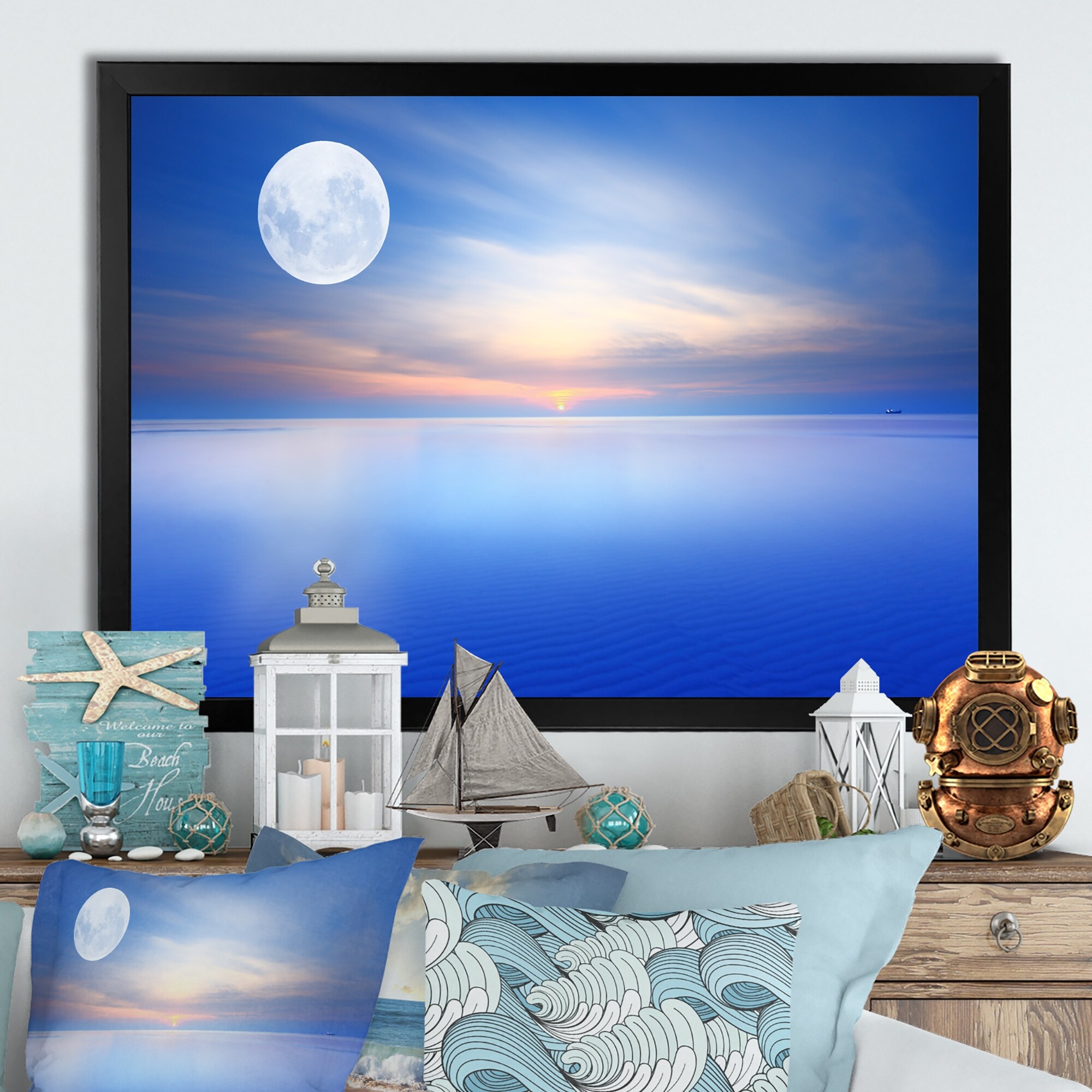 This beautiful Beautiful Moon Over Blue Sea II Framed wall Art is printed using the highest quality fade resistant ink on canvas. Every one of our Framed Giclee Prints is printed on premium quality canvas, using the finest quality inks which will not fade over time and then mounted and framed on a 1.5 inch wide frame.This framed art print is available in many different color frames. All of our framed art prints are carefully packaged with corner protectors, fragile labeling, and sturdy boxes to ensure a safe delivery. Every framed art arrives ready to hang on the wall, with the hanging kit included.Features:- Style : Nautical & Coastal- Subject : Beach, Nautical & Beach, Beach & Ocean- Color : Blue- Premium quality cotton canvas mounted.- Available in several frame colors. - Arrives with Free Shipping Over $49.99* Details Designart "Beautiful Moon Over Blue Sea II" Nautical & Coastal Framed Wall Art Product Description: This beautiful Beautiful Moon Over Blue Sea II Framed wall Art is printed using the highest quality fade resistant ink on canvas. Every one of our Framed Giclee Prints is printed on premium quality canvas, using the finest quality inks which will not fade over time and then mounted and framed on a 1.5 inch wide frame. This framed art print is available in many different color frames. All of our framed art prints are carefully packaged with corner protectors, fragile labeling, and sturdy boxes to ensure a safe delivery. Every framed art arrives ready to hang on the wall, with the hanging kit included. Features: - Style Nautical & Coastal - Subject Beach, Nautical & Beach, Beach & Ocean - Color Blue - Premium quality cotton canvas mounted. - Available in several frame colors. - Arrives with instructions and hanging kit