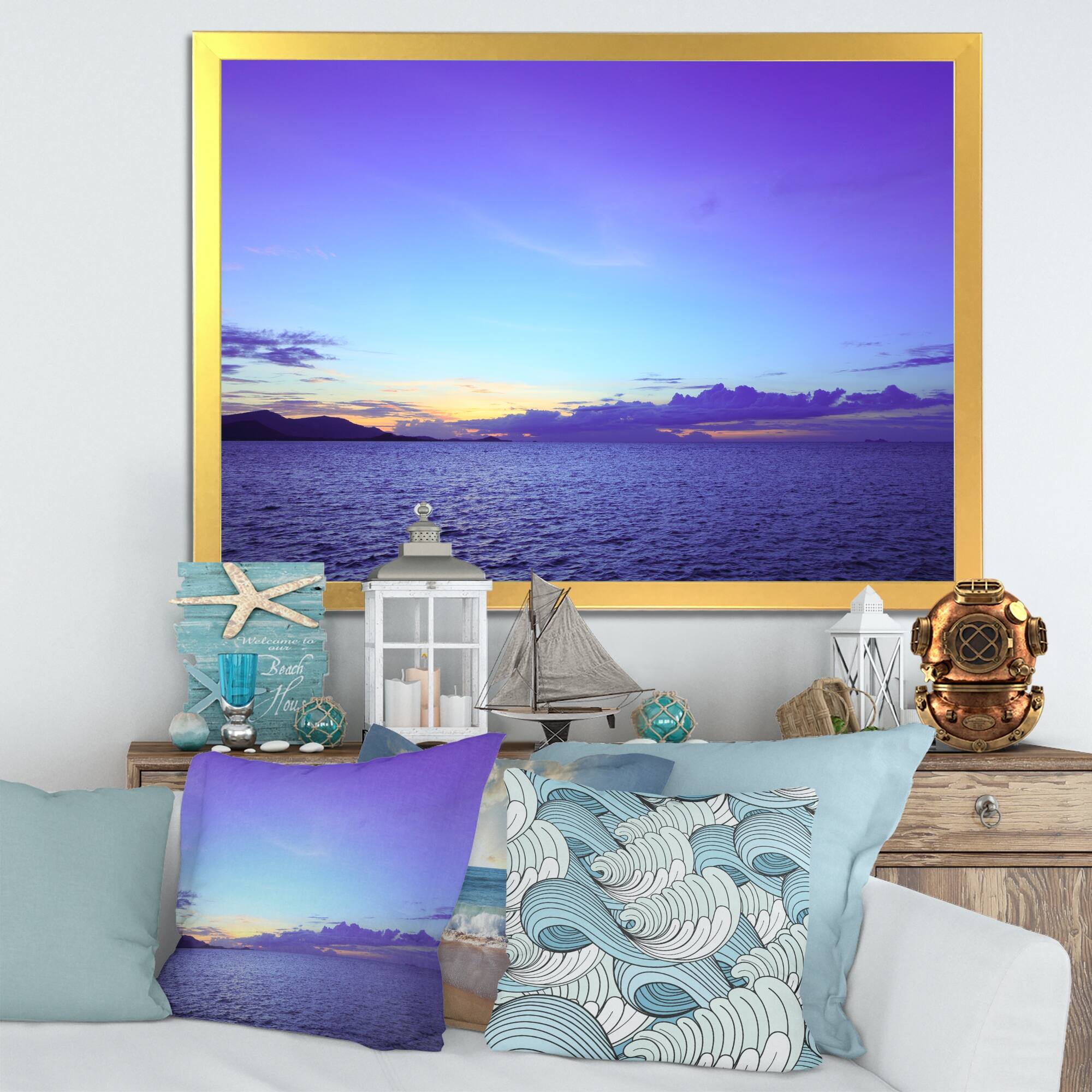 This beautiful Dramatic Panoramic Tropical Sunset IV Framed wall Art is printed using the highest quality fade resistant ink on canvas. Every one of our Framed Giclee Prints is printed on premium quality canvas, using the finest quality inks which will not fade over time and then mounted and framed on a 1.5 inch wide frame.This framed art print is available in many different color frames. All of our framed art prints are carefully packaged with corner protectors, fragile labeling, and sturdy boxes to ensure a safe delivery. Every framed art arrives ready to hang on the wall, with the hanging kit included.Features:- Style : Nautical & Coastal- Subject : sea & Shore, Nautical & Beach,Beach & Ocean- Color : Blue- Premium quality cotton canvas mounted.- Available in several frame colors. - Free Shipping Over $49.99* Details Designart "Dramatic Panoramic Tropical Sunset IV" Nautical & Coastal Framed Art Product Description: This beautiful Dramatic Panoramic Tropical Sunset IV Framed wall Art is printed using the highest quality fade resistant ink on canvas. Every one of our Framed Giclee Prints is printed on premium quality canvas, using the finest quality inks which will not fade over time and then mounted and framed on a 1.5 inch wide frame. This framed art print is available in many different color frames. All of our framed art prints are carefully packaged with corner protectors, fragile labeling, and sturdy boxes to ensure a safe delivery. Every framed art arrives ready to hang on the wall, with the hanging kit included. Features: - Style Nautical & Coastal - Subject sea & Shore, Nautical & Beach,Beach & Ocean - Color Blue - Premium quality cotton canvas mounted. - Available in several frame colors. - Arrives with instructions and hanging kit