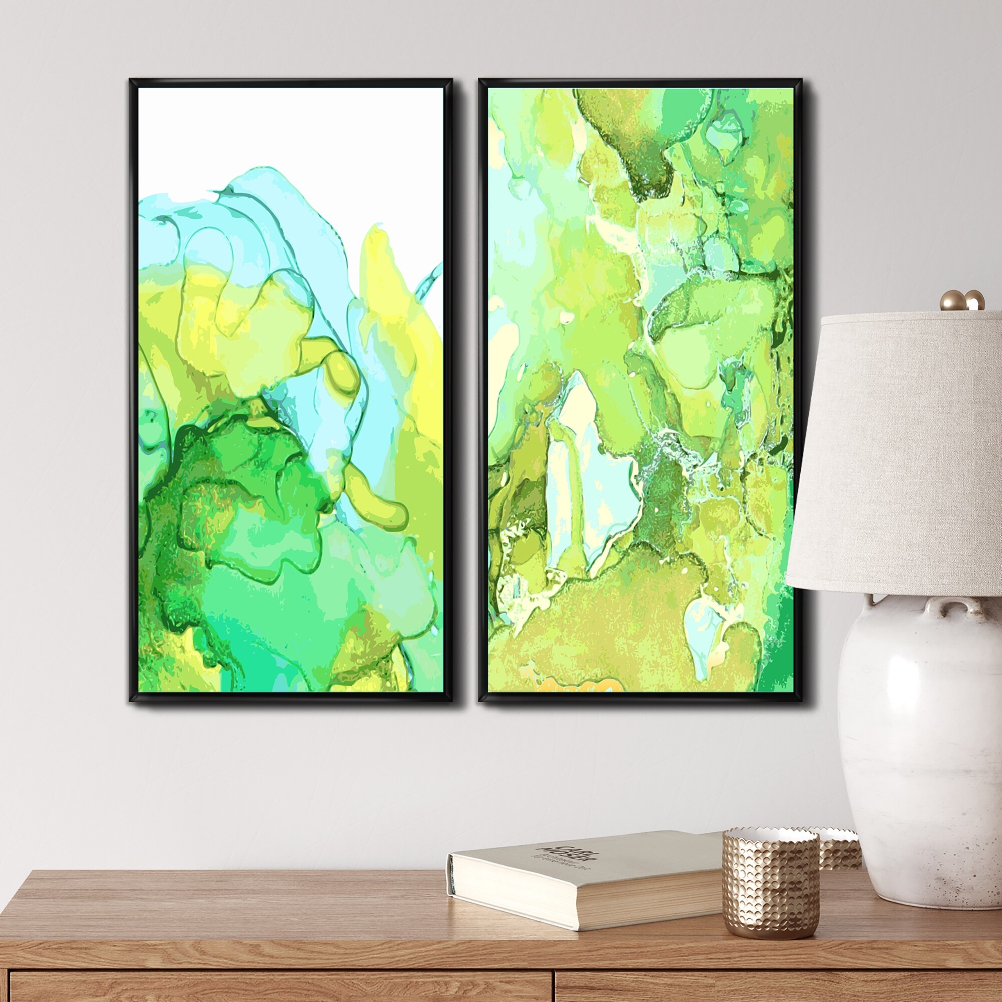 This Abstract Collage is a Collection of 2 Framed Canvas Art printed using the highest quality fade resistant ink on canvas. Every one of our fine art giclee canvas prints is printed on premium quality cotton canvas, using the finest quality inks which will not fade over time. Each giclee print is stretched tightly over a 1 or 1.5 inch wood sub frame ensuring the canvas is taught and does not buckle. The canvas print is inserted into a wood floating frame. All of our Framed canvas prints are carefully packaged with corner protection, fragile labeling and sturdy boxes to ensure safe delivery. Every framed canvas print arrives ready to hang on the wall, with the hanging kits included. This framed art print is available in many different color frames.- Set Include: 2 Pieces of 20"x40" / Free Shipping Over $49.99* Details Designart "Luxury Green and Blue Marble Abstract Flyers Set" Abstract Framed Art Product Description: This Abstract Collage is a Collection of 2 Framed Canvas Art printed using the highest quality fade resistant ink on canvas. Every one of our fine art giclee canvas prints is printed on premium quality cotton canvas, using the finest quality inks which will not fade over time. Each giclee print is stretched tightly over a 1 or 1.5 inch wood sub frame ensuring the canvas is taught and does not buckle. The canvas print is inserted into a wood floating frame. All of our Framed canvas prints are carefully packaged with corner protection, fragile labeling and sturdy boxes to ensure safe delivery. Every framed canvas print arrives ready to hang on the wall, with the hanging kits included. This framed art print is available in many different color frames. - Set Include2 Pieces of 20"x40" / 16"x32" / 12"x20" - Overall Dimensions (WxH) 40"x40" / 32"x32" / 24"x20" - Style Glam - Subject Abstract - Color Green - This canvas giclee print is gallery-wrapped (the design continues on the sides) , giving it a real art gallery feel. - Premium quality cotton canvas. - Arrives ready to hang on the wall - Easy to Hang