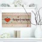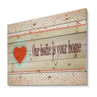 Greet your guests with this beautiful Entrance Wall Art to make them feel welcome. Once typically found only in rustic or farmhouse style decor settings, this Vintage wood wall art will easily fit into even the most contemporary of homes or offices.Using the highest quality 6 Color Canon UV Ink, this, this Farmhouse wood wall art incorporates several aspects of fine design into one stunning piece. With its slightly visible wood grain appearing through the colors and sleekly finished edges, it is a wonderful choice for any room in your home or office, being it a traditional or modern space. As each piece of wood has natural grain differences from the next, each of these wood wall arts is a truly unique addition to your space.Each Wood wall art is 100% handmade in Canada on Natural pine Free Shipping Over $49.99* Details Designart 'Our home is your home. Vintage Heart' Textual Entrance Art on Wood Product Description: Greet your guests with this beautiful Entrance Wall Art to make them feel welcome. Once typically found only in rustic or farmhouse style decor settings, this Vintage wood wall art will easily fit into even the most contemporary of homes or offices. Using the highest quality 6 Color Canon UV Ink, this, this Farmhouse wood wall art incorporates several aspects of fine design into one stunning piece. With its slightly visible wood grain appearing through the colors and sleekly finished edges, it is a wonderful choice for any room in your home or office, being it a traditional or modern space. As each piece of wood has natural grain differences from the next, each of these wood wall arts is a truly unique addition to your space. Each Wood wall art is 100% handmade in Canada on Natural pine wood, using the highest quality ink which will not fade over time. Available in 3 Different sizes :20x10; 40x20; 40x30 - OrientationHorizontal - SubjectVintage TypeWood Wall Art, Fine Art, Wood Fine Art, Print on Plaque - Arrives ready to hang on the wall with hanging kit included - MaterialMade with 100% natural pine wood - StyleFarmhouse - Number of Pieces1 - SizeLarge, Medium, Small