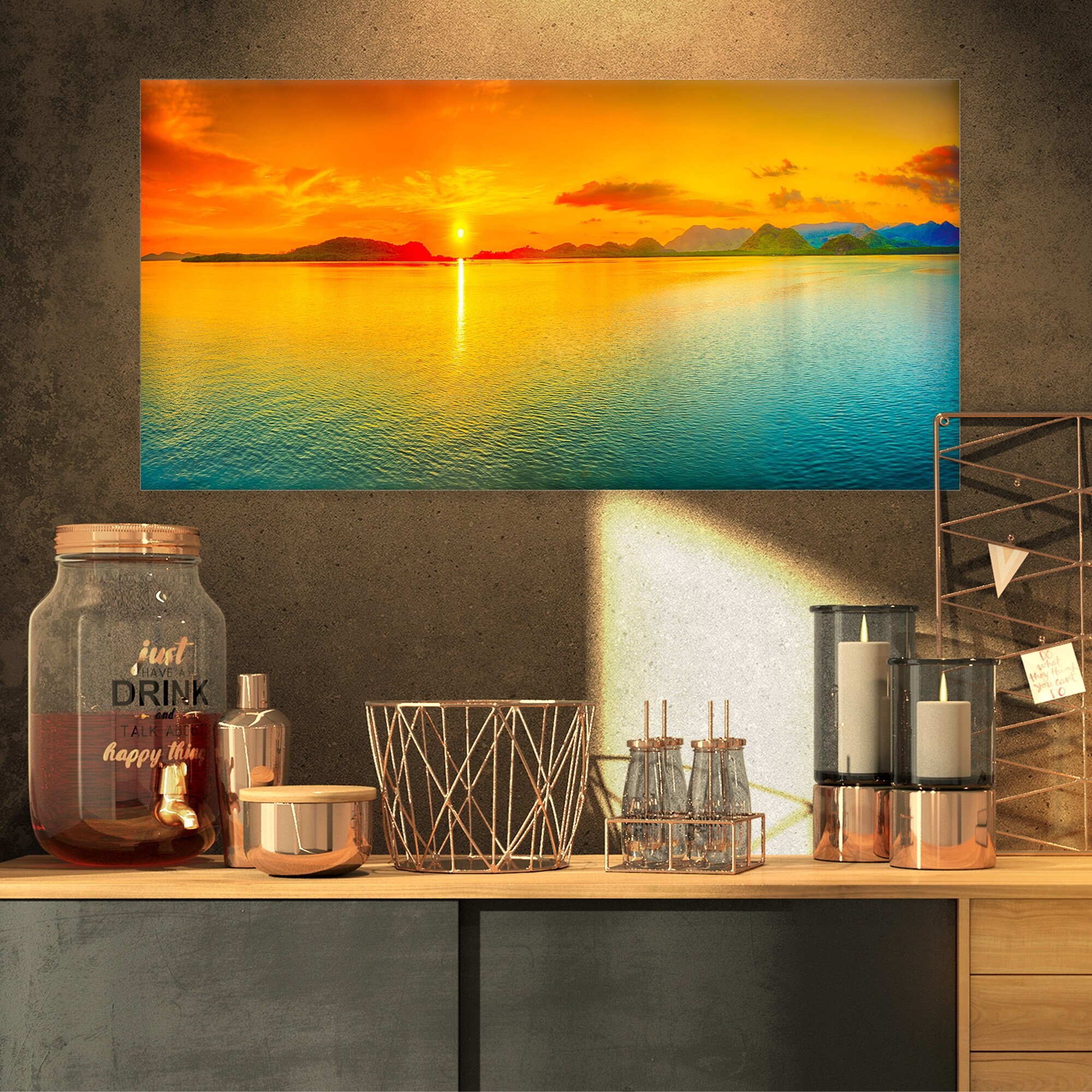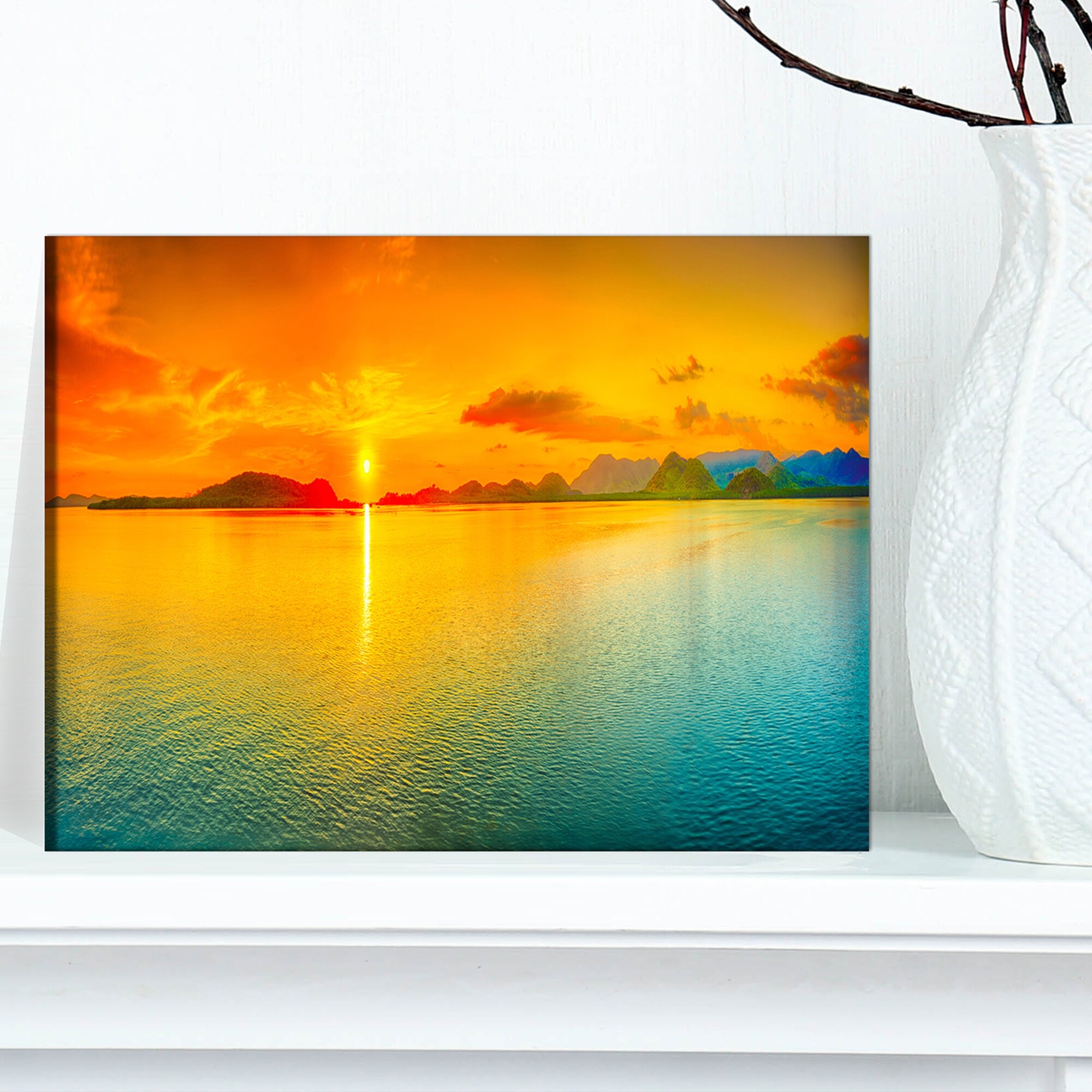 This beautiful Canvas Art is printed using the highest quality fade resistant ink on canvas. Every one of our fine art giclee canvas prints is printed on premium quality cotton canvas, using the finest quality inks which will not fade over time. Each giclee print is stretched tightly over a 1 inch wood sub frame ensuring the canvas is taught and does not buckle. This canvas art print is gallery-wrapped (the design continues on the sides) , giving it a real art gallery feel. All of our canvas prints are carefully packaged with bubble wrap, fragile labeling and sturdy boxes to ensure a safe delivery. Every canvas print arrives ready to hang on the wall, with the hanging kits included Orientation: HorizontalSubject: Nautical, Decorative, Sea & ShoreType: Canvas Art, Fine Art Giclee, Free Shipping Over $49.99* Details Designart - Sunset Over Sea Panorama - Seascape Photography Canvas Print Product Description: This beautiful Canvas Art is printed using the highest quality fade resistant ink on canvas. Every one of our fine art giclee canvas prints is printed on premium quality cotton canvas, using the finest quality inks which will not fade over time. Each giclee print is stretched tightly over a 1 inch wood sub frame ensuring the canvas is taught and does not buckle. This canvas art print is gallery-wrapped (the design continues on the sides) , giving it a real art gallery feel. All of our canvas prints are carefully packaged with bubble wrap, fragile labeling and sturdy boxes to ensure a safe delivery. Every canvas print arrives ready to hang on the wall, with the hanging kits included OrientationHorizontal SubjectNautical, Decorative, Sea & Shore TypeCanvas Art, Fine Art Giclee, Wrapped MaterialCanvas, Wood StylePhotography, Framed Art FramedFramed Exact ColorOrange SizeLarge, Oversized, Small Factory sealed boxes cannot be returned if opened.