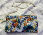 New with Tags Add some vibrant color to your outfit with this stunning designer handbag. The multi-color floral pattern is eye-catching and perfect for any occasion. The gold chain adds a touch of elegance and the snap closure keeps your belongings secure. This crossbody clutch purse is perfect for women who want to stay stylish and organized. The Madden brand is known for quality and this bag is no exception. The lining and hardware are also gold, adding to the overall luxury of the bag. Embrace the colorful theme with this beautiful handbag.
