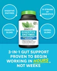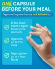 3-in-1 Formula – A potent blend of lab-proven enzymes, including bromelain and papaya, clinically proven probiotics, and prebiotics work synergistically to break down proteins, fats, and carbs while restoring digestive flora balance for optimal nutrient absorption and digestion. This formula helps maintain digestive wellness and promotes regularity. Fast-Acting Enzymes – Featuring powerful enzymes like bromelain (from pineapple) and papain (from papaya), this blend starts working immediately to break down food up to 39% more completely, easing indigestion for rapid, noticeable relief. Proven Probiotics – Guaranteed to arrive alive and work within hours in the small intestine where 90% of nutrient absorption occurs, helping support overall digestive health. Gas & Bloating Relief – Targeted enzymes, including bromelain and papaya, work with beneficial microflora to ease uncomfortable bloating, reduce gas, and soothe digestive discomfort naturally. Plant-Based Formula – Pure vegetarian enzymes, including bromelain and papain, combined with prebiotic fiber nourish your microbiome while supporting healthy digestion and immune function. Take 1 capsule before your meal to experience digestive delight.