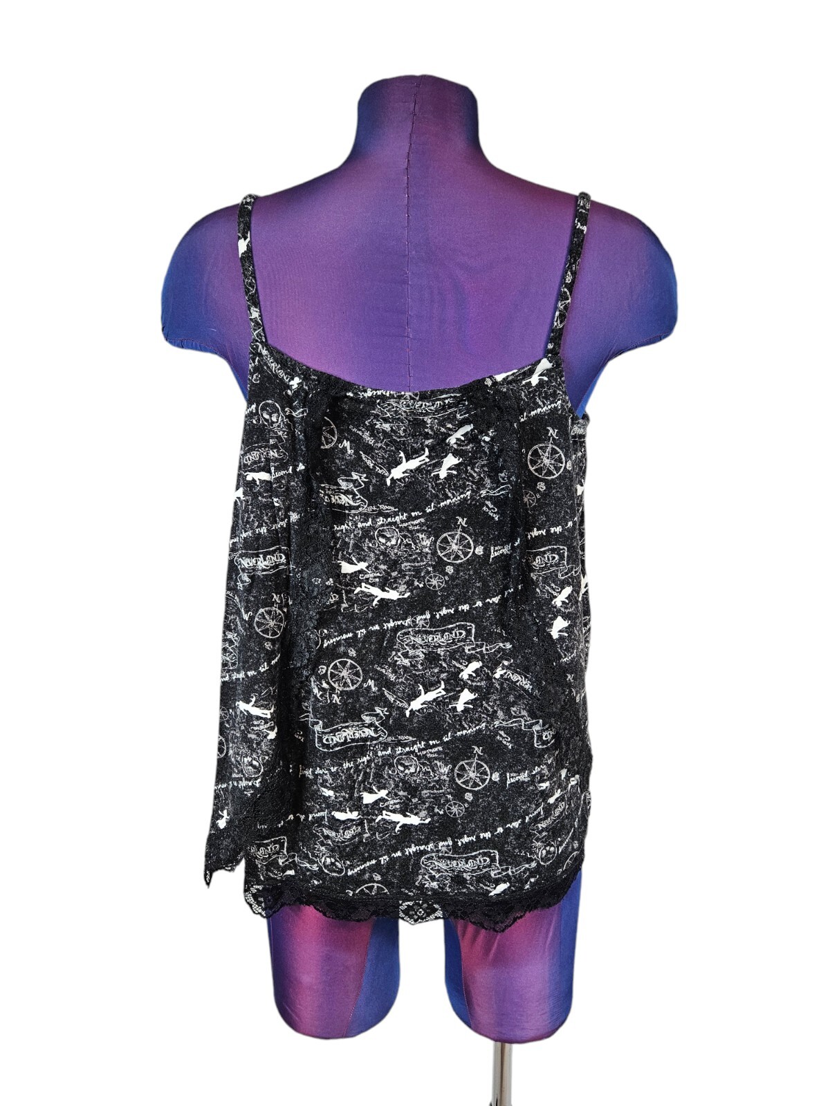 Disney Peter Pan Neverland Sleeveless Lightweight Cami Size Large Women's U48 In excellent condition Disney Peter Pan Neverland Sleeveless Lightweight Cami Size Large Women's. Features Disney's Peter Pan Off to Neverland lightweight tank top in simplistic black and white, sleeveless with spaghetti straps, bottom lace scalloped hem, split back with black lace trim, soft stretch fabric, silhouettes of Peter Pan flying with Wendy through Neverland, intentionally faded for vintage inspired look. Perfect tank top for your upcoming vacation to Disney World, Disneyland, or Disney Cruise! Made in USA Measurements laying flat chest 18.5" length 22.5" Fabric rayon, spandex This is a pre-owned item that may show signs of wear. In excellent condition, no flaws.