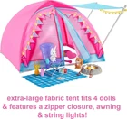 This It Takes Two playset inspires outdoor adventures with 'Malibu' and 'Brooklyn' Roberts dolls, plus everything the BFFs need to create the ultimate campsite. The extra-large fabric tent fits 4 dolls and features an awning and super-cool string lights. Set up camp with a firepit, 2 folding chairs, a blanket and telescope. Say hello to 2 animal pals -- press down on bunny's tail to see its ears wiggle, and press down on squirrel's tail to see it munch on an acorn. Spark starry night camping stories with marshmallow roasters, a lantern, card game, flashlight, snack, 2 water bottles and 2 colorful pillows. The BFFs wear cute camping clothes, like a hoodie and tie-dye shorts for 'Malibu' doll and a striped tank and star-printed pants for 'Brooklyn' doll. With 2 dolls and so many cool camping accessories, this It Takes Two playset inspires endless outdoor adventures for kids ages 3 and up. Product information Product Dimensions 13.56 x 18.08 x 9.57 inches Item Weight 1.18 pounds On Feb 16, 2025 at 18:28:05 PST, seller added the following information: