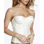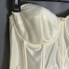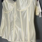 Listed is a Dominique Juliette bustier, a modern classic for women of all shapes and sizes and is the perfect solution under strapless gowns and other styles, or as an opaque and trendy bustier that is worn-to-be-seen! Ivory. New with tags. Size 42B. Style 8950. Retail $83. With a low back, and full hip length, this longline strapless bra transitions flawlessly beneath gowns and covers slip seams. Soft cushioned underwires are set in the Satin bodice, which is reinforced and inlaid with close set boning, smoothing and slimming your torso, back, sides and hips. Spandex power mesh back panels provide snug, smooth security and are comfort-enhanced with soft brushed elastic. Lightly lined, fiberfill cups have 3-part construction for no-show opacity and exceptional lift and shaping. Juliette is expertly constructed of refined, soft-touch fabrics edged with delicate lace details. Adjustable, removable garters are included. Secure hook and eye back closure. Thank you for looking!