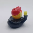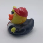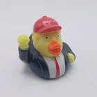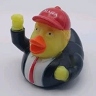 Donald J Trump rubber ducky stands 2 inches tall with Trump-like hand gesture, suit & tie, and hair.