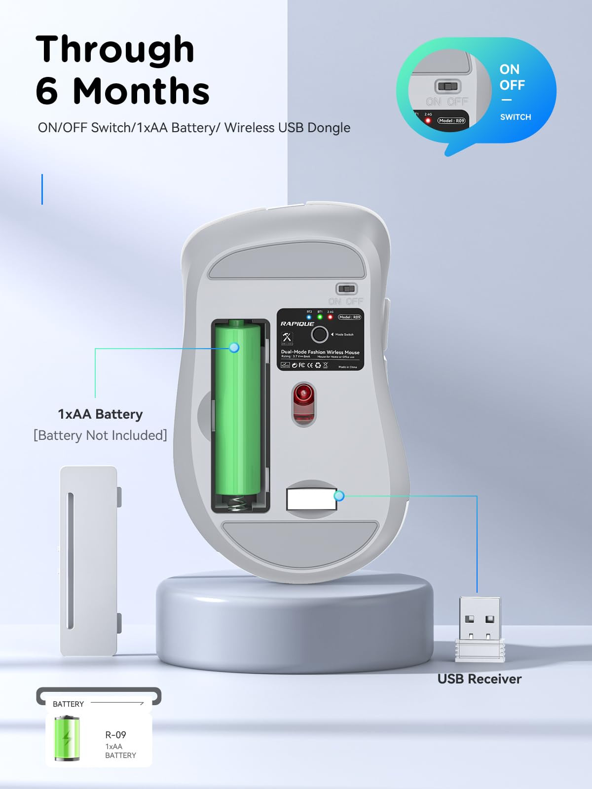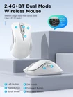 Elegant Color Palette: The R-09 Bluetooth Wireless Mouse boasts a refined design with a pristine white button and light gray frame, complemented by a sleek white scroll wheel. This sophisticated color combination enhances any workspace with a touch of modern elegance Dual Bluetooth & USB Wireless Mouse: The Wireless Mouse features both dual Bluetooth and USB connectivity options, allowing seamless switching between multiple devices like laptops, iPads, PCs, and MacBooks Ergonomic Design for Comfort: Designed with your comfort in mind, the ergonomic shape of this mouse ensures a comfortable grip for extended use, significantly reducing hand fatigue during long working hours Quiet Clicks for Distraction-Free Work: Enjoy a peaceful workspace with our silent-clicking technology, making this mouse ideal for quiet environments, whether at home or in the office Low Power Consumption: Powered by a single AA battery, this mouse boasts low power consumption, ensuring longer usage between battery changes and efficient performance Wide Compatibility: The Wireless Mouse offers broad compatibility with various operating systems, ensuring reliable performance whether you're using it with a laptop, iPad, MacBook, or Chromebook Note:1. 2.4Ghz USB mode is plug and play; 2. In Bluetooth mode, long press the mode switch button to pair with Bluetooth.