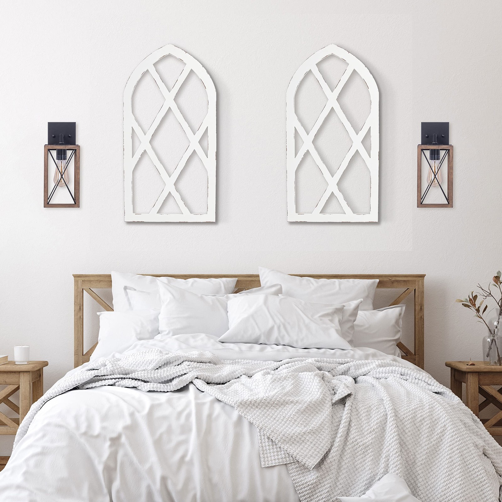 Bring warmth and elegance into your space with this 2-pack of arched window frame wall décor. Inspired by traditional cathedral windows, each piece features a tall, graceful arch and charming crisscross pattern that adds texture and architectural interest to any wall. Measuring 16 x 31 x 1 inches, these MDF wooden panels are lightweight yet durable—perfect for creating a cozy farmhouse vibe in your living room, bedroom, hallway, or entryway. Farmhouse-Inspired Wall Decor – Add timeless charm to your home with this 2-pack of arched window frame wall accents, perfect for rustic, vintage, or farmhouse-style interiors. Large Statement Size – Each window frame measures 16" W x 31" H x 1" D, making it an ideal focal point for living rooms, hallways, entryways, or above fireplaces. Durable Construction – Crafted from high-quality Medium Density Fiberboard (MDF), these decorative panels are lightweight yet sturdy for easy hanging and long-lasting beauty. Cathedral Arch Design – Features a classic arched shape with crisscross diamond lattice patterns reminiscent of traditional cathedral windows—elegant and eye-catching. Ready to Hang – Each piece includes built-in hardware for effortless wall mounting. Hang them side-by-side or separately to suit your decorating needs.