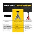 ESCO 3 Ton Performance Shorty Low Profile Jack Stands, 1 Pair Description The ESCO 3 Ton Performance Shorty Jack Stands, 1 Pair (Model 10499) is designed for the automotive professional with incredible quality and durability. These short low height professional grade jack stands are perfect for the garage or shop. Includes 2 jack stands with rubber top posts offering exceptional grip and support. Uniquely designed removable flat top rubber saddle protects the car frame better than the traditional curved axle post jacks stands. Each stand provides 7 adjustable height settings providing the exact support height needed for the job. Quickly and safely lock the position with the included locking pin. Tested to ASME standards by A2LA Certified Testing Facility. Features: 7 adjustable height positions Anodized post and powder coated base to prevent rusting and corrosion 6,000 lb. capacity per stand, includes 2 stands Minimum height 11 in., Maximum height 17 in. Base dimensions 9.5 x 9.5 in. Tested to ASME standards by A2LA Certified Testing Facility Product Details: Load Capacity: 3 Tons Maximum Lifting Height: 17 Inches Brand: ESCO Color: Grey Item dimensions L x W x H: 10 x 10 x 11 inches Load Capacity: 3 Tons Maximum Lifting Height: 17 Inches Brand: ESCO Color: Grey Item dimensions L x W x H: 10 x 10 x 11 inches Style: Low Profile Automotive Fit Type: Universal Fit Manufacturer: ESCO UPC: 816904025120 Model: 3 Ton Performance Shorty Low Profile Jack Stands, 1 Pair Item Weight: 21 pounds Product Dimensions: 10 x 10 x 11 inches Item model number: 10499-PAIR Manufacturer Part Number: 10499-PAIR Date First Available: August 5, 2022 Delivery We Do Not Ship Outside of the Continental US. Return Policy All items qualify for returns within 30 days of receipt. Seller is responsible for return shipping on any item that is not damaged. Feedback We take our reputation seriously, we buy and sell online, so we understand the value of trust. If you are unsatisfied with your order, please contact us and we will work with you to resolve it to your satisfaction.