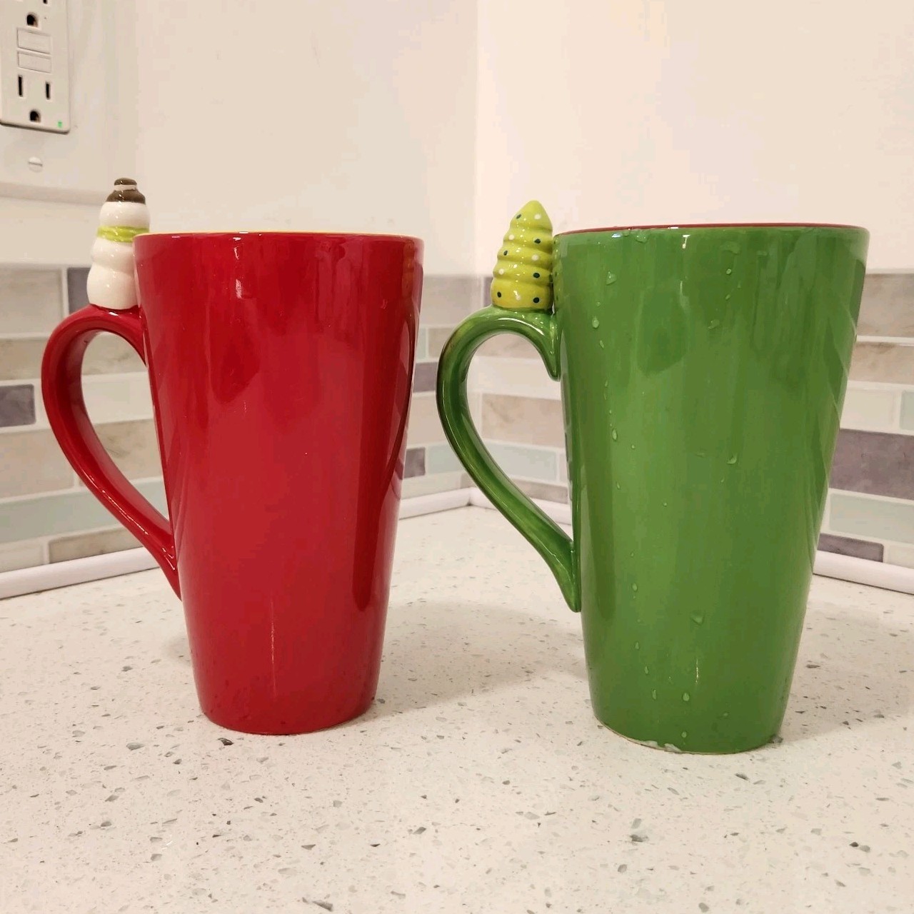 EUC set of 2 ~ 16OZ Tall Cute Christmas Mugs w/Santa & Snowman Gifts Parties. Condition is Used. Shipped with USPS Ground Advantage.