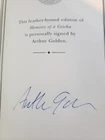 This is an Easton Press Arthur Golden Signed "Memoirs of a Geisha" Leather HC with Certificate of Authenticity. Book looks to be in Like New condition , some wear on gold edge, looks like never read . Has very light smoke odor. Pl ease see photos for condition. I have other items in my E-Bay store if you are interested. Please see above for shipping and handling. E-mail me with any questions. Thank You!!!