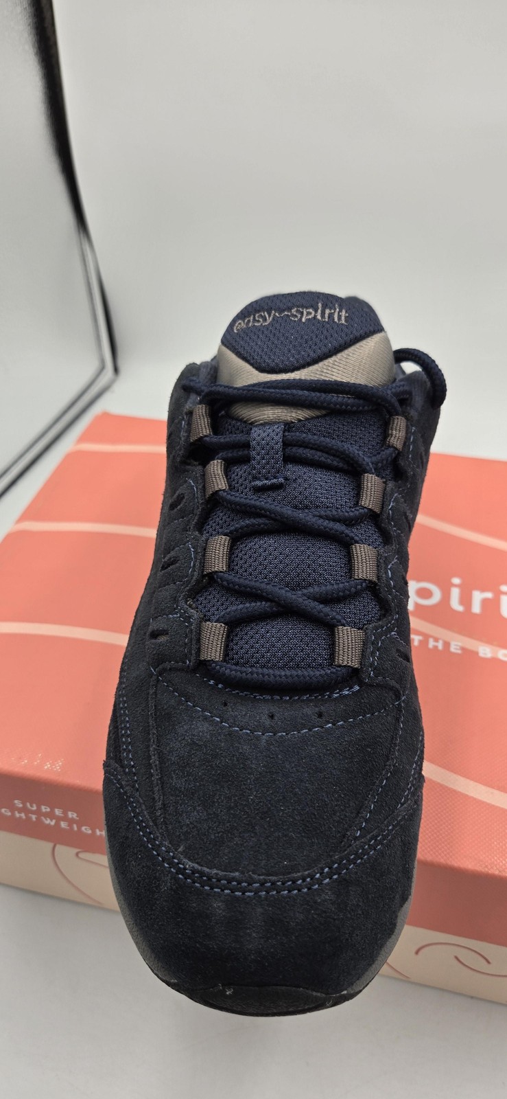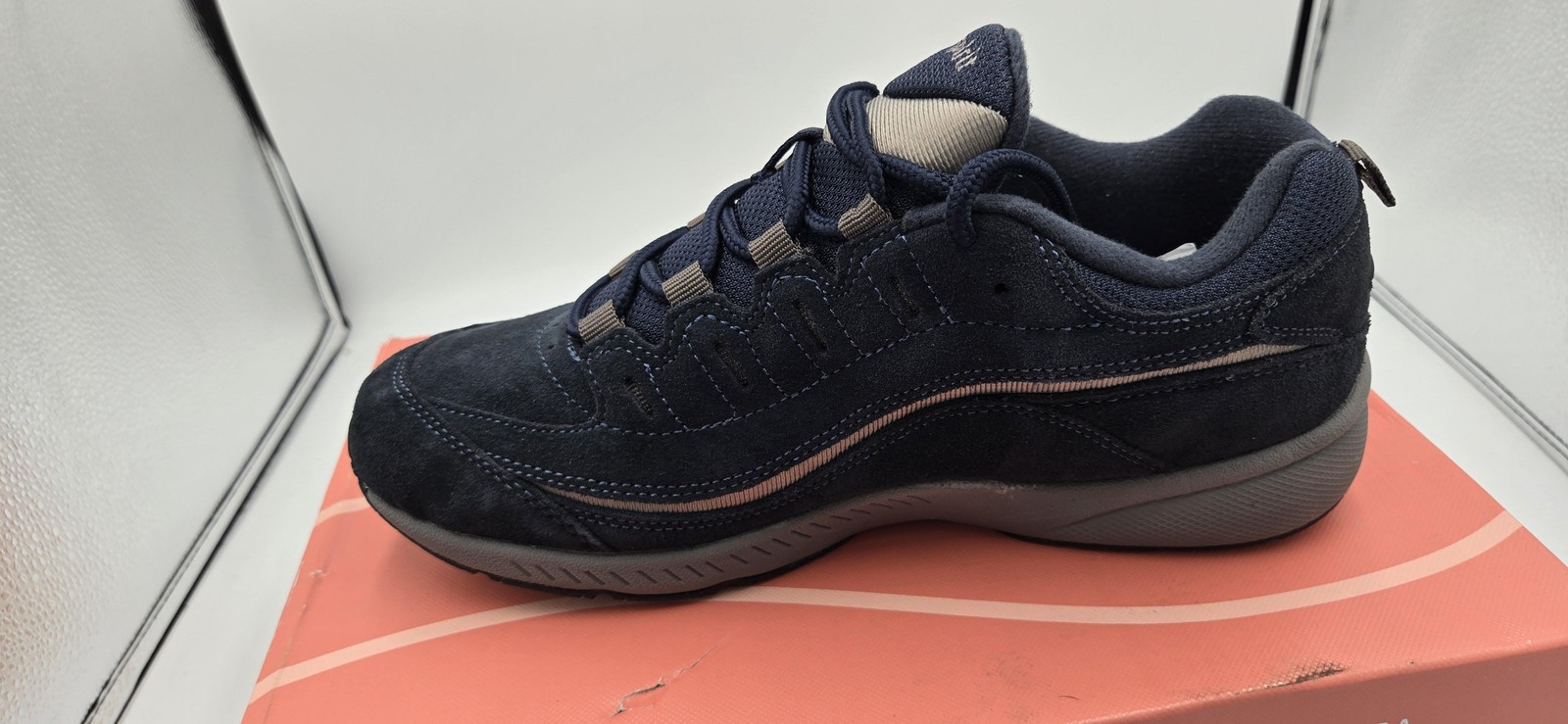 Brand: Easy Spirit Style: Romy e360 lace-up walking sneakers with low-profile athletic sole and cushioned interior. Color: Dark navy blue suede upper with gray accents, gray midsole, black and gray rubber outsole, navy fabric lining. Size: Womens US 8.5 W (wide width); UK 6.5; EU 39.5. Materials: Suede leather upper; fabric lining and cushioned insole; rubber outsole; balance man-made materials. Features: Lace-up closure for adjustable fit, padded collar and tongue, wide width comfort fit, lightweight ultra-flexible sole for walk/run support, Comfort Out of the Box cushioning, rear pull tab, WALK RUN side branding and Easy Spirit logos. Style/Model: Romy; style code 25023565-1GZ; color code BLUE MU SU; product line Easy Spirit e360. UPC: 720623543028. Includes original Easy Spirit shoe box with branding and labels; box shows surface tear, scuffs, and shelf wear from storage.
