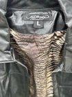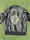 Embrace the wild with this Ed Hardy Leather Jacket in a bold tiger print. This vintage Y2K jacket is a must-have for any fashion-forward individual. Made with high-quality polyurethane, this jacket is designed to last. The black color and unisex design make it a versatile addition to any wardrobe. The jacket features a polyester lining for added comfort. This Ed Hardy jacket is perfect for anyone who wants to make a statement. The jacket is sized as L and is suitable for both men and women. The jacket's brand, model, and vintage status make it a unique piece that will stand out in any collection. Back design has slight peeling