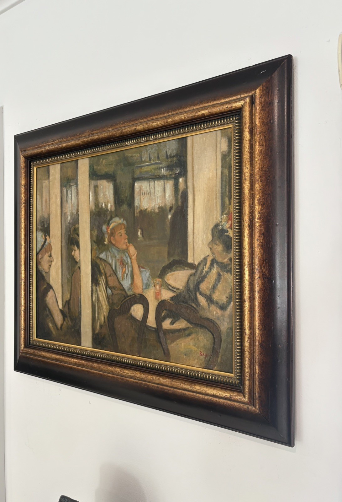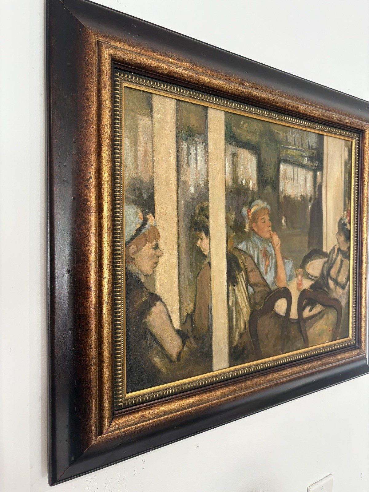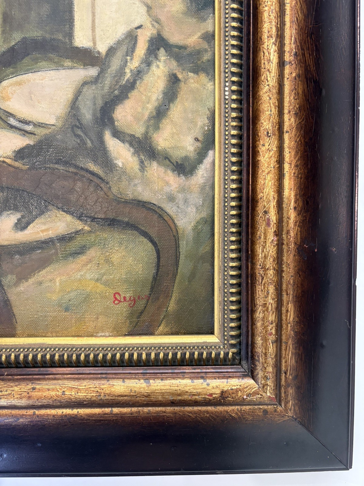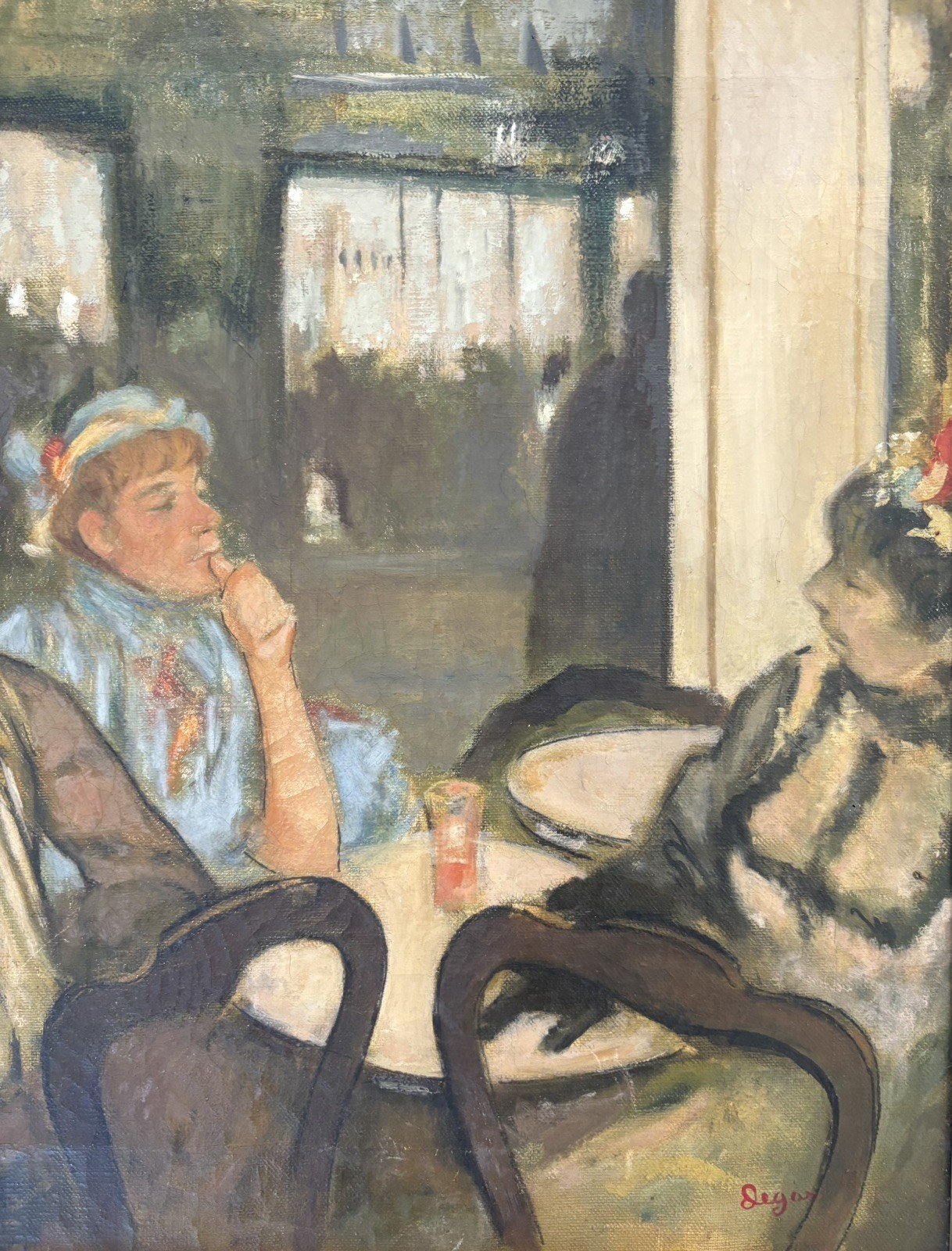 In the style of painting Hilaire-Germain-Edgar Degas. The piece is an great condition for its age. Degas was a French Impressionist artist known for his paintings, pastels, sculptures, prints, and drawings. Degas is considered a founder of Impressionism, which aimed to capture a moment in time as perceived by the artist, emphasizing natural light and casual human figures.