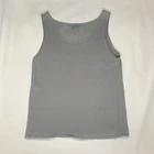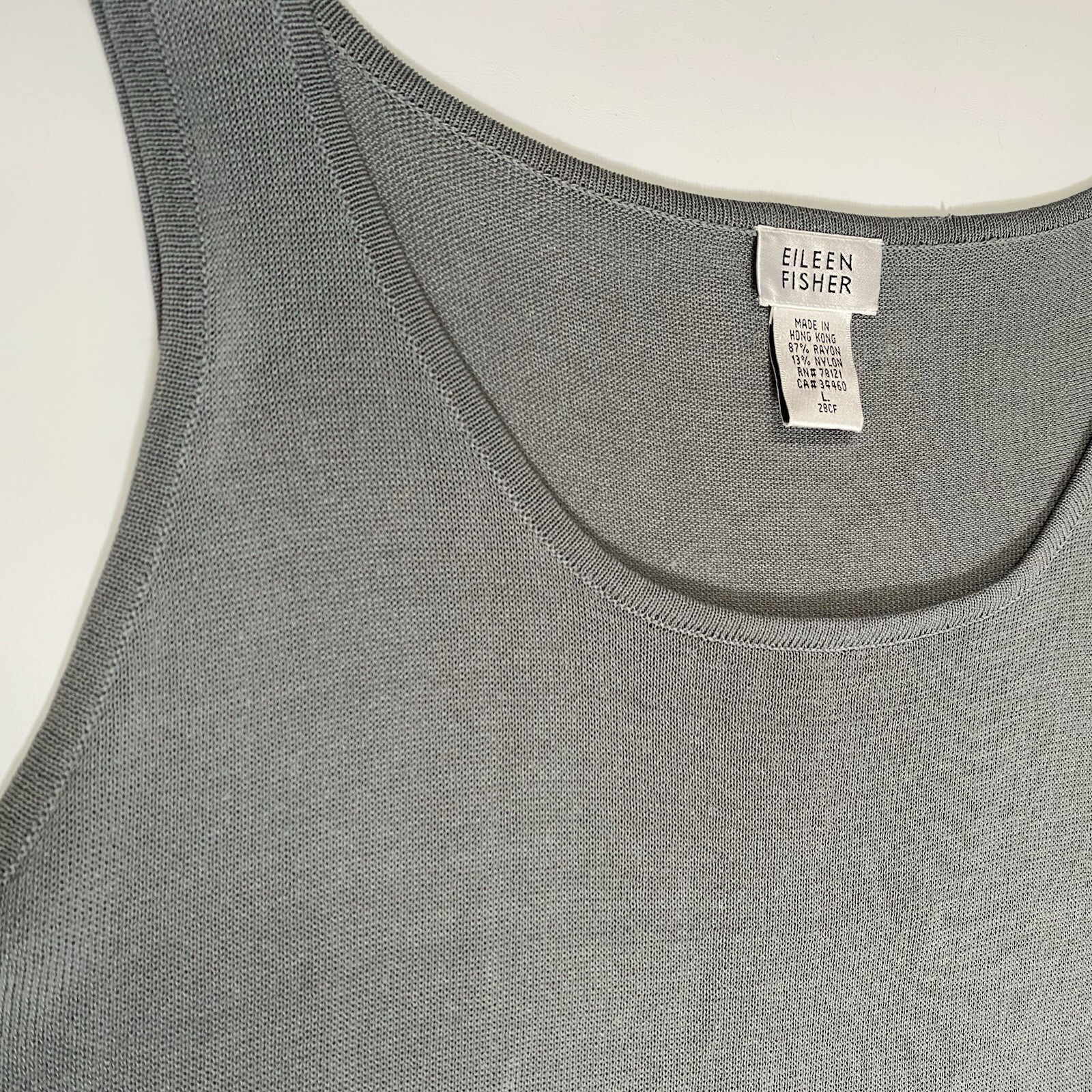 Eileen Fisher tank top in size Large with a scoop neck and sleeveless design The top is made of woven textured rayon material in a gray-blue color. It is a lightweight and breathable piece, suitable for casual wear in summer, fall, and spring. The wide strap tank has a basic style and a designer, classic theme, perfect for a versatile wardrobe.