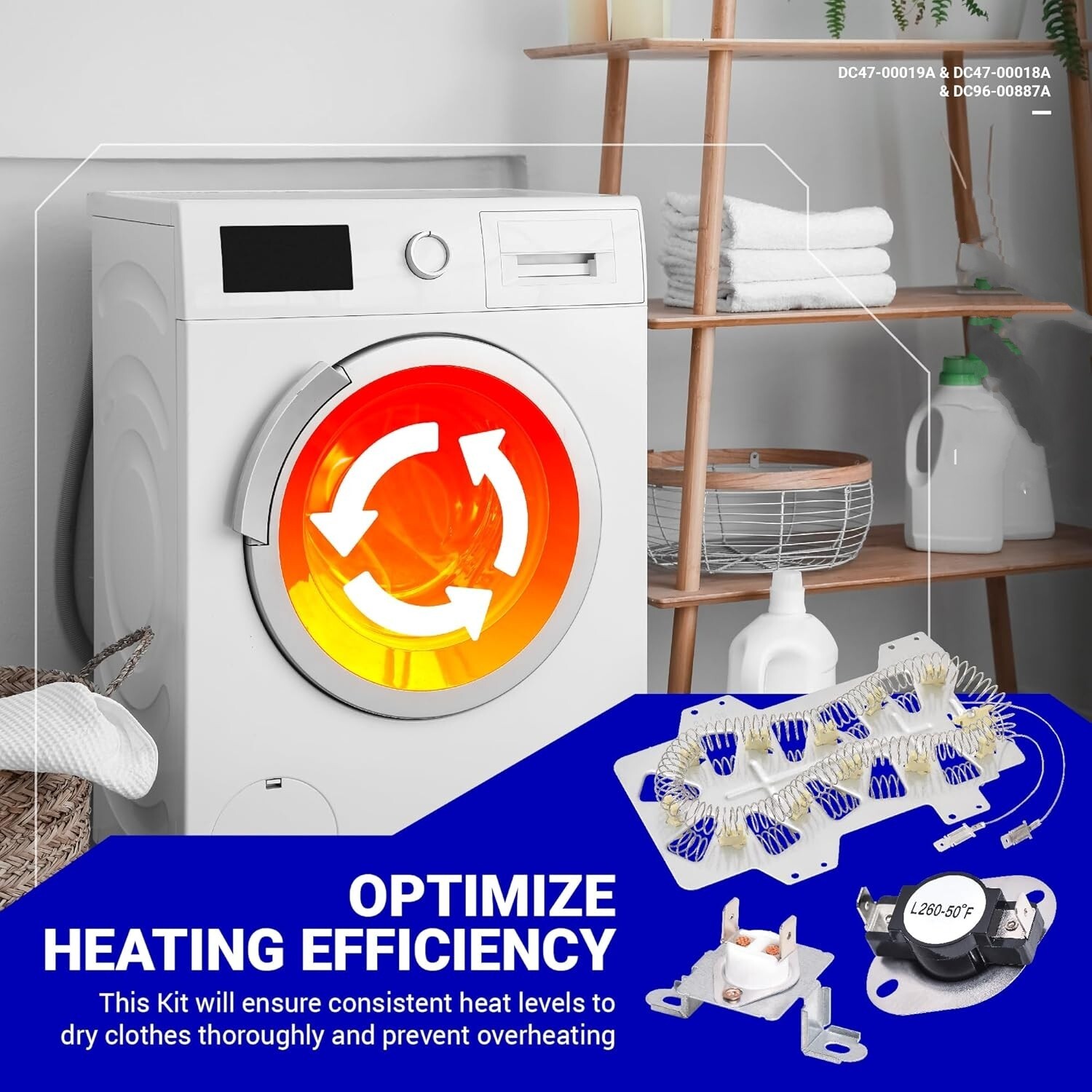Elemento Calefactor Para Secadora Resistente Al Calor Y A La Abrasión 240V NEW. KIT COMPLETO: incluye 1 elemento calefactor para secadora DC47-00019A (5300 vatios, 240 voltios), 1 termostato para secadora DC47-00018A, 1 fusible térmico para secadora DC96-00887A con soporte. Comprueba el número de modelo con atención antes de realizar el pedido. Si no estás seguro de la compatibilidad, envíanos el número de modelo de tu secadora y te ayudaremos a confirmar si es compatible o no. FÁCIL DE INSTALAR: compatible con la mayoría de las marcas más conocidas (Samsung, Kenmore). Compatible con los modelos: DV42H5000EW/A3, DV45H7000EW/A2, DV48H7400EW/A2, DV42H5200EP/A3, DV40J3000EW/A2, DV42H5200EW/A3, DV50M7450W. DV50M7450W/A3, DV448AEP/XAA, DV5451AEW/XAA, DV42H5000ES, DV331AER/XAA, DV5471AEP/XAA, DV56H9000EP/A2, DV448AEW/XAA, DV331AEW/XAA, DV419AEW/XAA, DV50F9A6EVW/A2, DV50F9A7EVP/A2, DV361EWBEWR/A3, DV393ETPAWR/A1, DV407AEW/XAA, DV45H7000EP/A3, etc. NÚMEROS DE PIEZA: ► DC47-00019A reemplaza los números de pieza: AP4201899, PS4205218, 35001247, 35001119, AP4045884, 1185561, AH2038533, EA2038533, PS2038533, ERDC47-00019A ► DC96-00887A reemplaza los números de pieza: PS2038484, AP4207819, DC96-00887C, AP5966894, PS4276292 ► DC47-00018A reemplaza los números de pieza: PS4205217, PS2038383, AP4201898, AP4201899, 35001092 CALIDAD PREMIUM: El NUEVO elemento calefactor para secadora Samsung DC47-00019A MEJORADO está hecho de METAL de alta calidad y contiene bobinas de alambre calefactor que tienen un contenido de níquel-cromo que alcanza el 85% para generar calor de manera efectiva en su secadora. Cumple perfectamente con los estándares OEM e incluso mejor con bobinas un 25% más largas que mejoran la resistencia al calor y la eficiencia hasta un 50% que las comunes: garantiza un rendimiento alto y duradero
