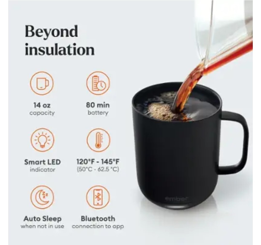 OVERVIEW Ember Mug 2 Copper Edition is a brilliant new take on Ember’s classic smart mug, and is guaranteed to make every morning shine. Ember allows you to set your preferred drinking temperature (120°F – 145°F), so you can enjoy your hot drink—just the way you like it— from the first sip to the last drop. Ember Mug 2’s built-in battery maintains your chosen drinking temperature for up to 80 minutes, or all day with the included charging coaster. FEATURES Sip And Savor Capacity: 14 oz (414 ml) Dimensions: 4.60 in (117.0 mm) x 3.46 in (88.0 mm) Weight: 16.01 oz (457 g) Long Lasting Battery Life Maintain your perfect drinking temperature in the Ember Mug 2 for 80 minutes on a single charge or all day on the included Charging Coaster 2. Charge Status Indicator Set your empty Ember Mug on the included Charging Coaster 2 to charge. The smart LED light on the front of the Mug will breathe red when charging and be solid green when fully charged. The LED is white when heating or monitoring a hot beverage. Easy Cleaning Every Ember Mug 2 is IPX7 rated for full underwater submersion making your Mug easy to hand wash, rinse or soak Your Temperature, Your Way Set the temperature of your hot drink down to the degree. Start with the preset 135°F or select your favorite temperature from a range of 120°F to 145°F (48.9°C to 62.8°C). Auto Sleep Simply start pouring to turn on your Ember Mug 2. When empty, it will automatically enter sleep mode to conserve power. Ember intelligently turns on and off using patented sensors to detect liquid level and temperature. Ember App Once you’ve paired your Ember Mug 2 to the Ember app, remotely set your drinking temperature, save presets for all your favorite drinks, try our tea steeping timers, or personalize the smart LED to your favorite color. The Ember App is compatible with iOS and Android devices. No More Microwaving Enjoy your hot beverages for hours without ever using a microwave. For safety reasons, the Ember Mug 2 should never be placed in a microwave oven. What's Included?? Ember Mug 2, 14oz, Copper, Charging Coaster, Power Adapter, Quick Start Gui⁵⅘