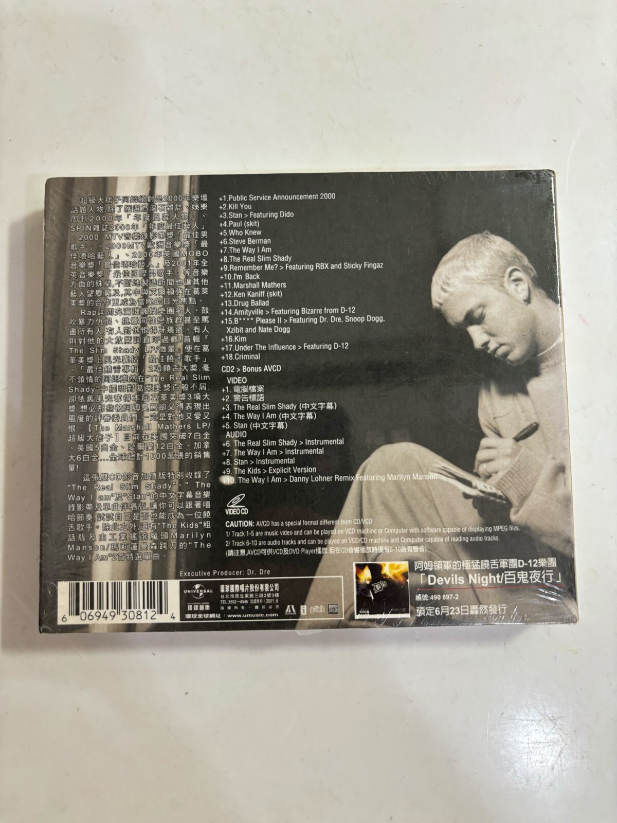 The Eminem The Marshall Mathers LP Taiwan only LTD Bonus 2CD The CD is released by Universal music Taiwan. The 2 CD is in mint condition and Sealed. Tracking list: 1. Public Service Announcement 2000 2. Kill You 3. Stan - Dido 4. Paul (Skit) - 5. Who Knew 6. Steve Berman - Steve Berman 7. Way I Am 8. Real Slim Shady 9. Remember Me? 10. I'm Back 11. Marshall Mathers 12. Ken Kaniff (Skit) 13. Drug Ballad 14. Amityville - Bizarre 15. Bitch Please II - Nate Dogg 16. Kim 17. Under the Influence 18. Criminal CD2 Bonus AVCD: 1. Computer file 2. Warning slogan 3. The Real Slim Shady (Chinese subtitle) 4. The Way I Am (Chinese subtitle) 5.Stan (Chinese subtitle) AUDIO: 6. The Real Slim Shady (Instrumental) 7. The Way I Am (Instrumental) 8. Stan (Instrumental) 9.The Kids (Explicit Version) 10. The Way I Am (Danny Lohner Remix) Information P.S: I am an excellent seller: rolex-611, I have to start a new account because of Ebay system problems, buyers can go to my previous account to browse, and can buy CDs with me at ease I hope the transaction can be completed in 5 days. The shipping cost is $ 15.00 USD. I can accept the Payoneer or PAYPAL.If you have any problem about how to pay the money, please feel free to contact with me. You have to agree all conditions listed above and have no doubt when you decide to bid my items. Please do not hesitate to contact me if you have any further question