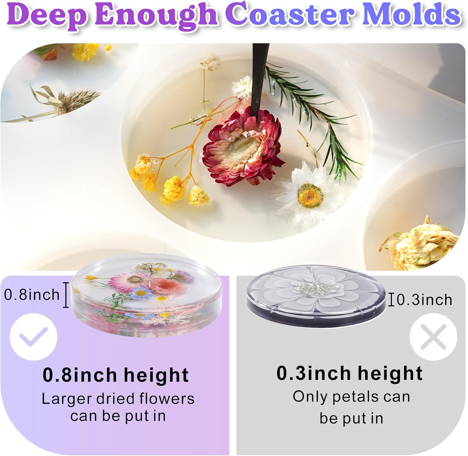 Deep Epoxy Resin Molds: With a generous 0.8-inch depth of our epoy mold, the possibilities are endless! Elevate your coaster crafting game by incorporating larger fillers like wood, delicate flowers, or experimenting with halo stains. Unleash your creativity and craft innovative coasters that stand out from the crowd. Versatility Beyond Coasters: These versatile silicone resin molds aren't just for coasters. From wedding flowers to intriguing insect specimens, the possibilities are endless. Create unique paperweights or encapsulate cherished mementos with ease. The timeless round shape ensures your creative ideas flow freely, allowing you to present your masterpieces flawlessly. Package Include: 1 pc resin coaster molds with 6 cavity, the overall size of the mold is 8.6x13x0.8inch, the diameter of the individual coaster is 3.9 inch, filling a coaster requires 5.56oz epoxy resin. LET'S RESIN epoxy molds silicone are compatible with many casting materials, especially good for epoxy resin, casting resin, not for coating resin. Excellent Product Quality: Our epoxy resin molds are crafted from premium silicone which is flexible & not easily deformed, washable & easy to clean, easy to use & de-mold, reusable & durable. They have glossy interiors which ensure the finished products have a glossy and smooth surface without polishing. Easily help you make shiny resin art. 100% Satisfaction Guarantee: These silicone molds for resin with a glossy interior surface, you can use mold release spray or mild soapy water to de-mold easily. For the 3D resin silicone molds, please remember to use a wood stick to remove the air bubbles. If you encounter any problems when using LET's resin products, please feel free to at any time. LET'S RESIN strives to offer you 100% satisfaction. Product Description 0.8INCH HEIGHT COASTER MOLDS SILICONE COASTER MOLDS FEATURES 1 Easy to Demold 2 THICKENED MOLD 3 Resuable More Choices of Exquisite Molds Add to Cart Add to Cart Customer Reviews 4.4 out of 5 stars 87 4.4 out of 5 stars 598 4.8 out of 5 stars 577 4.7 out of 5 stars 2,684 4.4 out of 5 stars 47 4.6 out of 5 stars 44 Price $15.65 $ 15 . 65 $18.18 $ 18 . 18 $10.79 $ 10 . 79 $7.19 $ 7 . 19 $15.99 $ 15 . 99 $16.99 $ 16 . 99 Material Sturdy Silicone Sturdy Silicone Sturdy Silicone Sturdy Silicone Sturdy Silicone Sturdy Silicone Surface Smooth Interior Smooth Interior Smooth Interior Smooth Interior Smooth Interior Smooth Interior Easy to Demold ✔ ✔ ✔ ✔ ✔ ✔ Not Easy to Deform ✔ ✔ ✔ ✔ ✔ ✔ Easy to Clean ✔ ✔ ✔ ✔ ✔ ✔