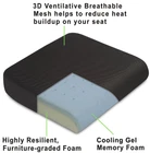 EXTRA-LARGE COMFORT (19"x17"x3"): Our extra-large size seat Cushion gives you a more comfortable fit. BREATHABLE COOLING MEMORY FOAM: Soft memory foam top layer supported by a firm premium base foam, covered with is a layer of 3D ventilated fabric to disperse heat. WON’T FLATTEN OUT: -layer design for Custom-fitting comfort every time you sit on it without flattening out. NON-SLIP COVER: Non-slip silicone layer at the bottom to keep it in place. RELIEVES BACK PAIN: Firm enough to support you and soft enough to be comfortable.