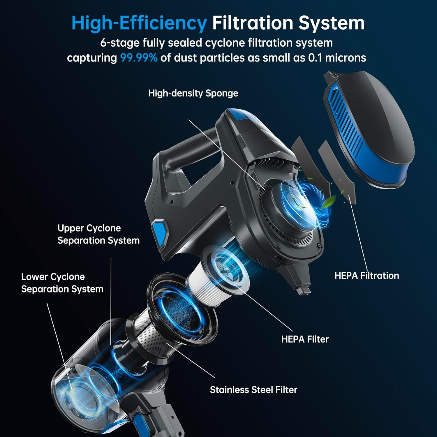 FABULETTA Cordless Vacuum Cleaner, 30Kpa/380W Stick Black-blue Product Details Brand: FABULETTA Special Feature: Brushless Motor, Max 30KPa Powerful Suction, Max 50mins Runtime, 8x2500mAh Detachable Battery, Cordless Filter Type: HEPA Filter Included Components: 2 HEPA Filter & Cleaning Tool, Power Floor Brush with Led Lights, Dusting Brush, Adjustable Telescopic Alloy Tube, Long Crevice Tool Is Cordless?: Yes Capacity: 1.5 Liters Wattage: 380 watts Runtime: 50 minutes Charging Time: 4 Hours Recommended Uses For Product: Carpet, Hard Floor Form Factor: Stick Color: Black-blue Model Name: FSV003 Product Dimensions: 17.5"L x 11.8"W x 7.6"H Battery Description: Lithium-Ion Noise Level: 75 dB Amperage: 12.84 Amps Battery Life: 50 minutes Manufacturer: FABULETTA Number of Items: 1 Controller Type: Push Button Motor Horsepower: 0.51 horsepower Control Method: Touch Style: Black-blue Number of Speeds: 3 Portable: Yes Number of Handles: 1 Number of Power Levels: 3 Number of Wheels: 2 Series Number: 3 Indoor/Outdoor Usage: Indoor Finish Type: Glossy Item Weight: 5.5 pounds Country of Origin: China Item model number: FSV003 Batteries: 1 Lithium Ion batteries required. (included) Finish types: Glossy Batteries required: Yes Battery type: Lithium-Ion Special Feature: Brushless Motor, Max 30KPa Powerful Suction, Max 50mins Runtime, 8x2500mAh Detachable Battery, Cordless Brushless Motor, Max 30KPa Powerful Suction, Max 50mins Runtime, 8x2500mAh Detachable Battery, CordlessBrushless Motor, Max 30KPa Powerful Suction, Max 50mins Runtime, 8x2500mAh Detachable Battery, Cordless See more Included Components: 2 HEPA Filter & Cleaning Tool, Power Floor Brush with Led Lights, Dusting Brush, Adjustable Telescopic Alloy Tube, Long Crevice Tool 2 HEPA Filter & Cleaning Tool, Power Floor Brush with Led Lights, Dusting Brush, Adjustable Telescopic Alloy Tube, Long Crevice Tool2 HEPA Filter & Cleaning Tool, Power Floor Brush with Led Lights, Dusting Brush, Adjustable Telescopic Alloy Tube, Long Crevice Tool See more Surface RecommendationPower Source: Hard Floor and CarpetBattery Powered VoltageItem Weight: 29.6 Volts5.5 Pounds 【Powerful Suction with Upgraded Brushless Motor】The FABULETTA FSV003 cordless vacuum cleaner is equipped with a high-performance Brushless Motor, with a maximum suction force of up to 30Kpa. Whether it's dust, dirt, or pet hair, this cordless vacuum cleaner ensures thorough cleaning on various surfaces, leaving your home spotless. Choose different suction modes(High/Middle/Low) according to different scenarios to reduce power consumption 【Up to 50 Mins of Runtime】The FABULETTA stick vacuum cordless rechargeable features a detachable 8x2500mAh large capacity battery, providing max 50 minutes of cleaning in standard mode. It only takes 4-4.5 hours to be fully charged, only a single charge can provide a thorough deep cleaning of the entire house, without stopping to charge the battery, allowing you to enjoy the fun of cleaning 【6-in-1 Multi-function Vacuum】] FABULETTA lightweight cordless stick vacuum cleaners for home come with Floor Brush with LED light, Long crevice tool, Dust Brush, and adjustable Telescopic Alloy Tube. The various attachments can deeply clean furniture, such as floors, short-pile carpets, beds, curtains, pet cushions, and even cars, capable of all kinds of tasks you need, bringing you the best cleaning performance and efficiency 【High-Efficiency Filtration System】FSV003 vacuum cleaner cordless equipped with 6-stage fully sealed cyclone filtration system, capturing 99.99% of dust particles as small as 0.1 microns. And release of ultimate purified air while effectively preventing secondary pollution, providing your family with fresher air. The large dust cup capacity allows multiple cleaning sessions without frequent emptying 【Flexible LED Motorized Floor Brush Head】The vacuum cleaner floor brush head has a built-in independent motor for extra power. The LED headlights of the floor brush illuminate the dust, debris, and hair under furniture or other hard-to-reach dark corners and track it. Flexible 150° sideways rotation and 90° up and down rotation let you clean the dust under furniture and bed. Relaxing your wrist and arm with an ergonomic handle