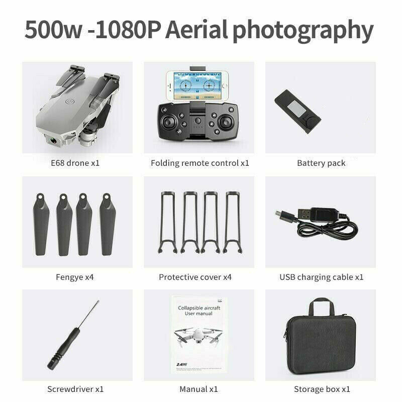 Description: Item NO.: E59 Frequency: 2.4G Channel: 6CH Motor: Brush Motor Quadcopter Battery: 3.7V 600mAh Lipo (Included) Transmitter Battery: 3*1.5V AA Battery ( NOT Included ) Flying Time: about 15mins Charging Time: 120mins R/C Distance: 150m Color: Gray Camera : 2.4G WiFi 4K HD FOV: 120° Wide Angle Quad's Size: 25*17*5.5cm (the arms not folded) 12.5*8*5.3cm (the arms folded) Features: - With foldable arm, small size, easy to carry. - With 2.4G wifi function can be connected APP, APK system to take pictures/video, real-time transmission through the phone camera image - With altitude hold mode function provides stable flight. - With Headless Mode,no need to adjust the position of aircraft before flying . - With One key to return function makes it easily to find the way home. - One Key Takeoff /Landing. One press automatically taking off or landing, the drone will take off or go back to the position where it took off. - 2.4GHz Technology Adopted for Anti-Interference. - The quadcopter fuselage is made of high strength and resistant engineering plastics,lightweight and durable resistance. -Gesture photo/video. Adopting advanced recognition technology, the aircraft makes gestures towards the aircraft during the flight. The aircraft automatically takes pictures after recognizing the gestures, which is more convenient. -Orbit flight. Plan the flight path of the aircraft to focus on shooting Function: Surrounding Flight, Waypoint Flight, Altitude Hold Mode, Headless Mode, One Key Return, One Key Takeoff /Landing, WiFi FPV, Camera/Video, Gesture photo/video, Orbit flight Package Included: 1 x E59 RC Quadcopter 1 x Remote Control 3 x 3.7V 600mAh Lipo Battery 1 x USB Charging Cable 4 x Protection Cover 2 x Spare Blades 1 x Screwdriver 1 x User Manual