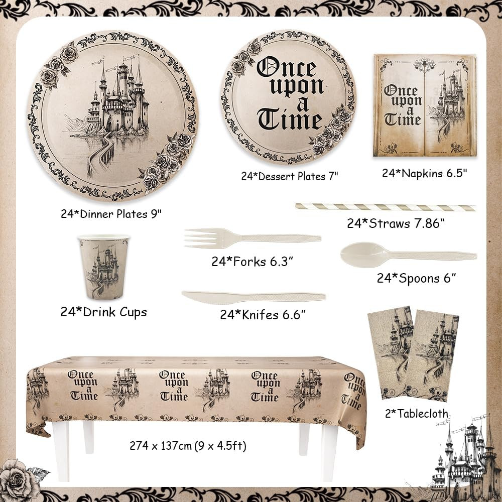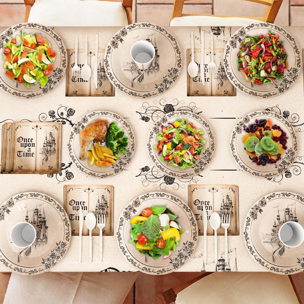 Fairytale Party Decorations Once Upon a Time Birthday Party Supplies Dinnerware Tableware Set Castle Opening Book Party Supplies for Birthday Baby Shower Party Decorations Serve 24