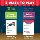 Act! Shout! Chuckle! Roar! We've included separate game modes to play through - the always favorite Classic Charades and a fun group acting game called Switch Charades. Classic Charades - You know how to play! Players take turns acting while the rest of the group guesses. Switch Charades - A twist for game night! Players take turns guessing while the rest of the team acts together! Over 750 charade ideas are included in 250 cards for hours of family fun. Ages 5+ 3+ Players Includes images for non-readers so everyone can get in on the action. Includes 750 charades across both games (300 Classic, 450 Switch) Includes 250 total cards, 1 sand timer and 1 scoring pad
