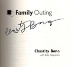 UP FOR SALE IS A 1998 LITTLE BROWN HARDC0VER 1ST EDITION / PRINTING ( 10 9 8 7 6 5 4 3 2 1 ) OF - ' FAMILY OUTING 'WRITTEN AND SIGNED ON THE TITLE PAGE BY CHAS BONO ( THEN SIGNING CHASTITY) . TOP OF PAGE EXTERIOR AND PART OF THE SIDE PAGE EXTERIOR HAVE A SPILL SPOT AND BACK HALF OF PAGES HAVE CORNER WEAR AT TIP. BOOK BOARDS HAVE LIGHT EDGE/CORNER WEAR.AND DJ HAS LIGHT EDGE/CORNER AND SURFACE WEAR. OVERALL CONDITION IS GOOD . PLEASE SEE ALL PHOTOS.THANKS FOR LOOKING AND PLEASE CHECK OUT MY OTHER STORE ITEMS. All S igned books featured have been purchased at bookstore signings or after the signing, book fairs, estate sales, and other reputable dealers. We do not issue individual certificates of authenticity, but do unconditionally guarantee that all signed books have been hand signed by the stated Author of the book and are not a copy or forgery. Shipping is free for media mail in the US only with a 4 - 8 day delivery time. U.S Flat Rate Priority mail is available at USPS rates with 3 - 5 day delivery time for US only. International shipping is by USPS First Class International mail only. Tracking number included. Items shipped within 24 hours after purchase on business days - Monday through Friday. Refunds given as money back less return postage upon safe return of item. Please contact if there is a problem so we can help. Not accepting best offers at this time. Thanks.