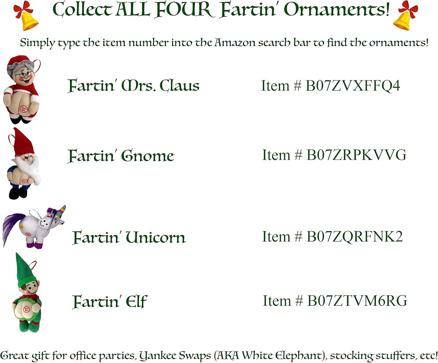 Polyester FUNNY CHRISTMAS ORNAMENT-Simply Squeeze, with both hands, the Farting Elf Ornaments body and he will fart to the tune of Deck the Halls. Squeeze a second time and it will stop farting. Be sure to look for his brothers, sisters and friends the Farting Unicorn Ornament, Farting Gnome Ornament, Farting Mrs Clause Ornament, Naughty Gingerbread Man and Naughty Snowman, Reindeer Farts, all the best top rated Christmas Ornaments for 2022! MAKES A GREAT GIFT AND STOCKING STUFFER-This Xmas give the gift of laughter to your friends and family. Put him on the Shelf with your Elf! BEST CHRISTMAS ORNAMENT 2023-This year has been one of the most stressful years, why not give the GIFT OF LAUGHTER with our funny Farting Elf Ornament. HIT OF THE OFFICE PARTY-This Farting Elf Ornament may be a little dirty but he is a great inappropriate WHITE ELEPHANT-SECRET SANTA gift for the Holidays! KIDS WILL LOVE IT-Kids think the Farting Elf is Hilarious. They absolutely love it and think its adorable. FUNNY CHRISTMAS ORNAMENT-Simply Squeeze, with both hands, the Farting Elf Ornaments body and he will fart to the tune of Deck the Halls. Squeeze a second time and it will stop farting. Be sure to look for his brothers, sisters and friends the Farting Unicorn Ornament, Farting Gnome Ornament, Farting Mrs Clause Ornament, Naughty Gingerbread Man and Naughty Snowman, Reindeer Farts, all the best top rated Christmas Ornaments for 2023