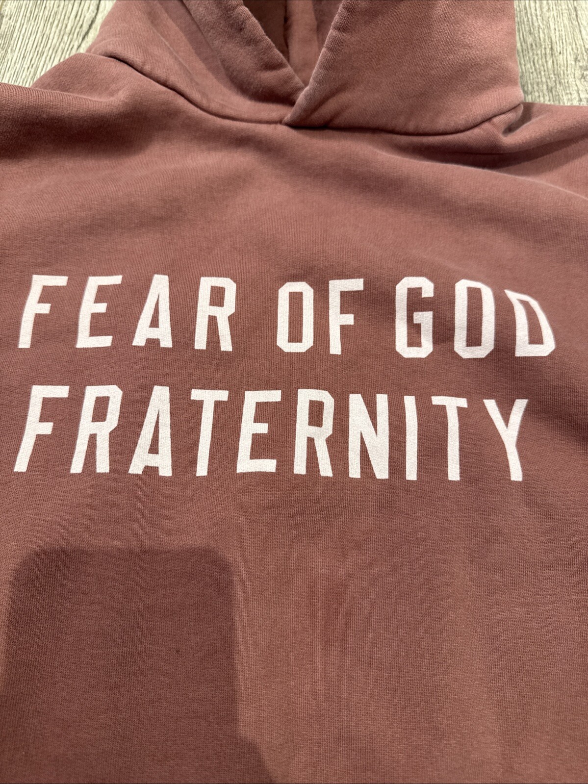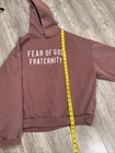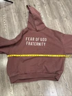 Stay cozy and stylish in this Fear Of God Fraternity FOG Essentials Hoodie in size Medium. The crimson color adds a bold touch to your wardrobe, while the heavyweight material ensures warmth and comfort. Perfect for men looking for a high-quality pullover from a reputable brand like FOG Essentials. Ideal for casual outings or lounging at home, this hoodie is a must-have for any fashion-forward individual. With its regular fit and pullover style, it's easy to pair with your favorite jeans or joggers for a laid-back yet trendy look. Upgrade your activewear collection with this premium piece from Fear Of God. Purchased on SSENSE proof of purchase available upon request measurements shown in photos please contact if you have any questions