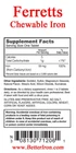 EASY & DELICIOUS IRON SUPPLEMENTATION - Our lemon-lime flavored iron chewables for kids and adults offer a tasty and hassle-free alternative to traditional pills, with no metallic aftertaste or the need to swallow, making iron supplementation easy and enjoyable MADE IN THE USA - Ferretts iron chews are proudly made in the USA with a commitment to American quality and expertise, providing quality you can trust for the iron supplements you need GENTLE & NON-CONSTIPATING FORMULATION - Our 18mg chewable iron tablets are derived from carbonyl iron to ensure easy absorption in the body and gentle digestion, eliminating the discomfort experienced in traditional iron supplements. Ideal for post-bariatric patients seeking comfortable iron support Preferred for TAILORED FOR DIETARY SENSITIVITIES - Our iron chewables for women and men are suitable for vegetarians and others with dietary sensitivities, formulated without gluten, dyes, and soy, providing an ideal chewable iron supplement to align with your dietary preferencesSurgery BOOST YOUR ENERGY - With our chewable iron supplement, replenish your iron levels to combat fatigue stemming from iron deficiency conditions like anemia while boosting vitality, supporting cognitive function, red blood cell formation, and circulation, and enhancing your overall well-being. DISCLAIMER: These statements have not been evaluated by the Food and Drug Administration. This product is not intended to diagnose, treat, cure or prevent any disease.